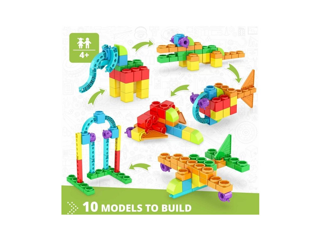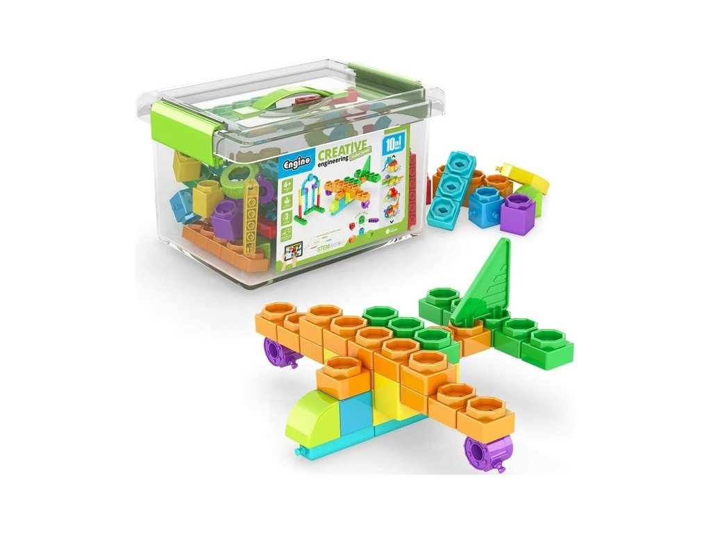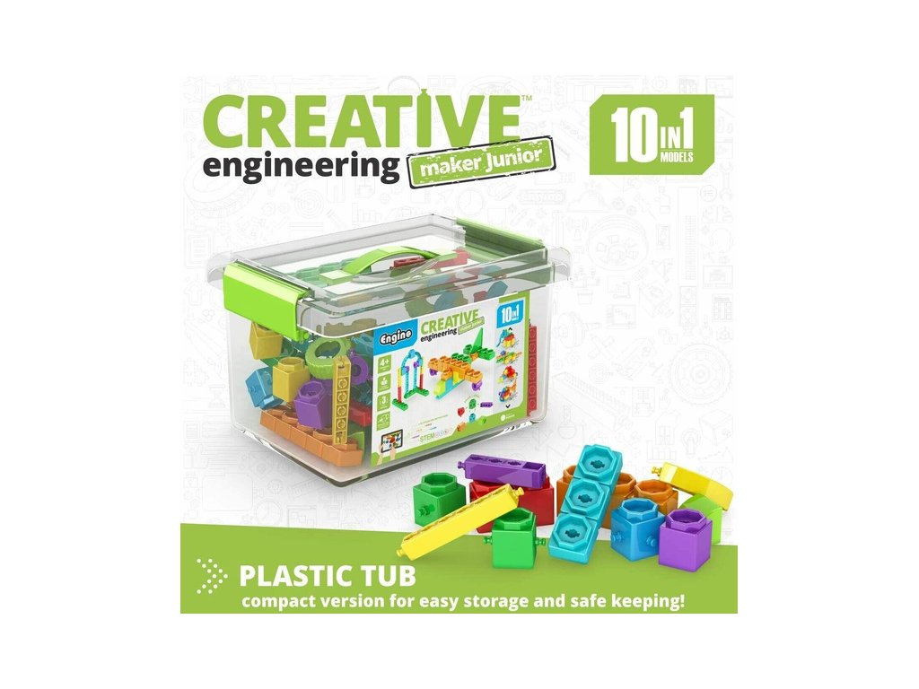 Engino Creative Engineering 10 modelů Junior je stavebnice pro děti od 4 let, pomocí které můžou postavit 10 modelů dle návodu a mnoho dalších dle své fantazie. Sada obsahuje tištěnou příručku s příběhy, v níž jsou obsaženy fakta o každém modelu.