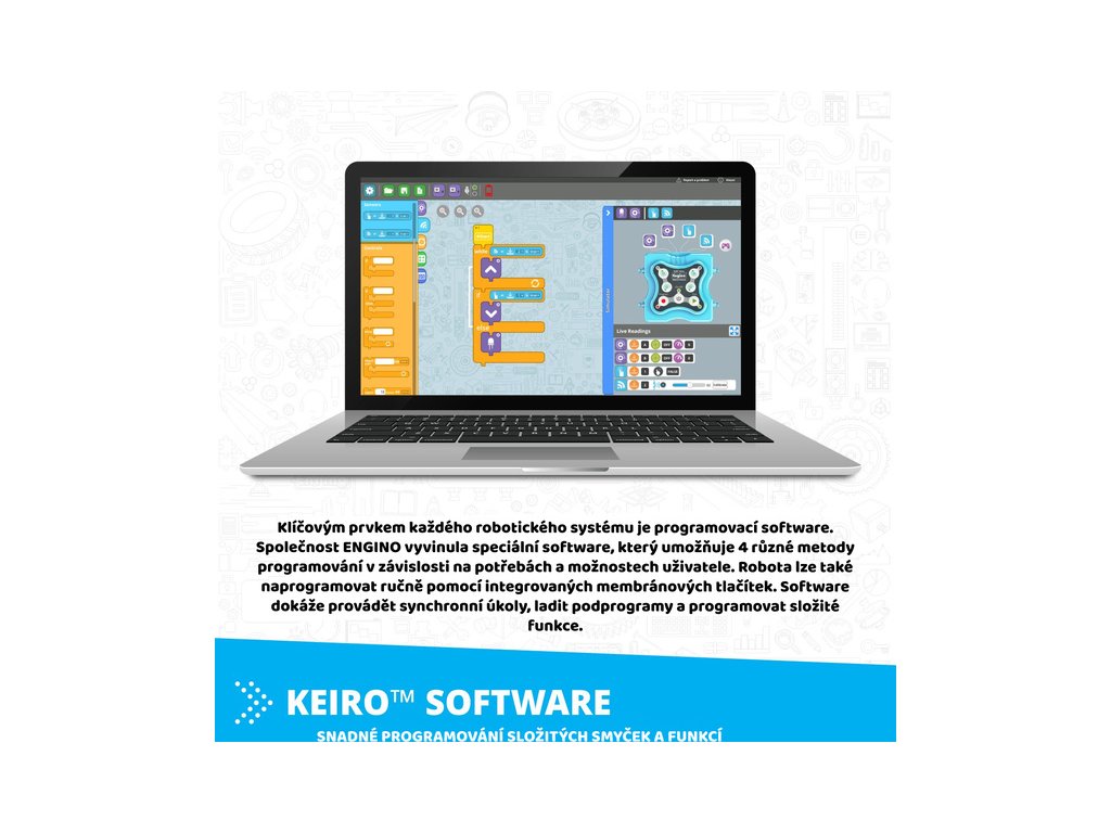 Postavte si a naprogramujte vlastního robota. Klíčovým prvkem každého robotického systému je programovací software. Společnost ENGINO vyvinula speciální program Keiro, který umožňuje 4 různé metody programování v závislosti na potřebách a možnostech uživatele. Robota lze také naprogramovat ručně pomocí integrovaných membránových tlačítek. Software dokáže provádět synchronní úkoly, ladit podprogramy a programovat složité funkce.