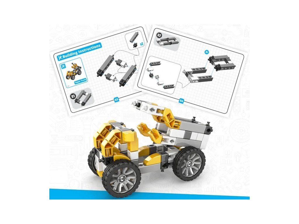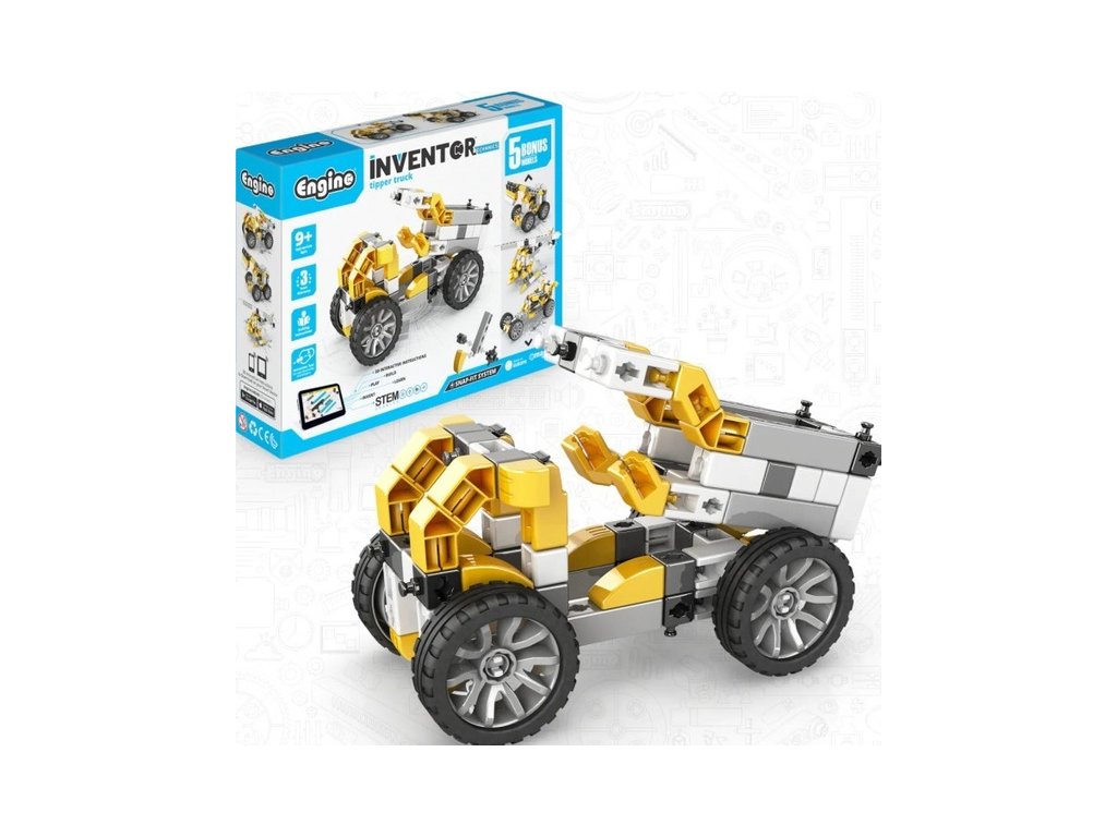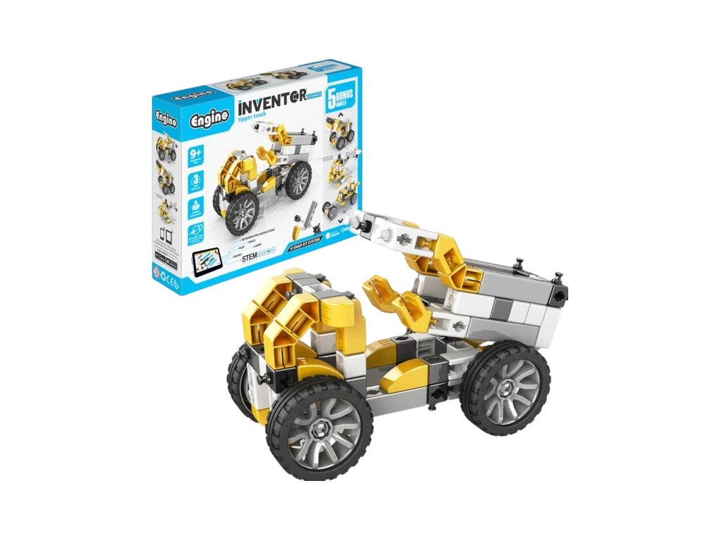 Stavebnice pro děti od 9 let, Engino Inventor Mechanics sklápěč, sestavit lze 5 různých modelů, jako stavební stroje, vrtulník, závodní auto a další. Jednoduchá kreativní stavebnice pro děti, s možností využít stávající díly k dalším stavebnicím Engino. Obrázkový přehledný barevný návod.