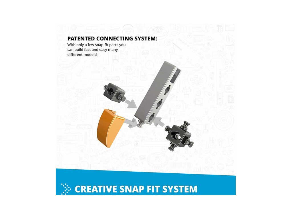 - Inovativní design: Patentovaná zaklapávací konektivita a vícesměrné otočné čepy umožňují stavět z různých úhlů až ze 6-ti stran současně.
