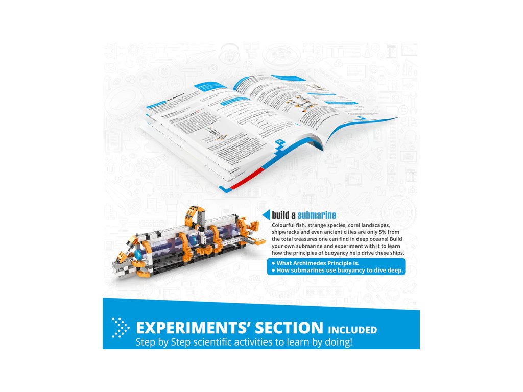 Voda a vzduch jsou dva nejdůležitější prvky pro život a spadají do stejného názvu tekutina, což je společný název pro kapaliny a plyny. Pohyb vzduchu určuje teplotu v našich místnostech. Potrubí dodávají vodu do našich domovů. Průmyslové a stavební stroje využívají hydrauliku pro snadné zvedání těžkých předmětů. Letadla a lodě mění směr pomocí aerodynamiky a hydrodynamiky. Přemýšleli jste někdy nad tím, proč předměty klesají ve vodě, zatímco jiné plavou? Jak proudí krev v našem těle? Jak fungují vodní nádrže? S touto sadou si můžeš postavit 6 různých modelů, včetně člunu a ponorky, jakož i různých experimentálních souprav, aby ses naučil vše o dynamice tekutin! Součástí jsou tištěné návody na stavbu pro 4 modely a další 2 modely jsou dostupné online a prostřednictvím bezplatné aplikace kidCAD pro chytrá zařízení.