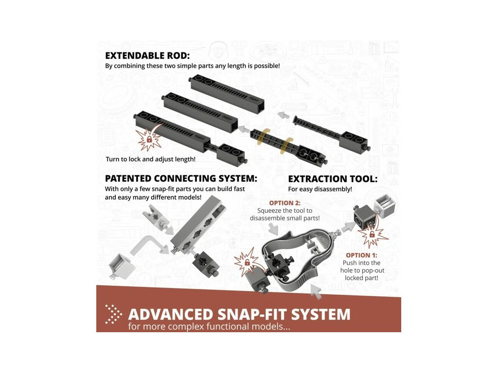 - Inovativní design: Patentovaná zaklapávací konektivita a vícesměrné otočné čepy umožňují stavět z různých úhlů až ze 6-ti stran současně.