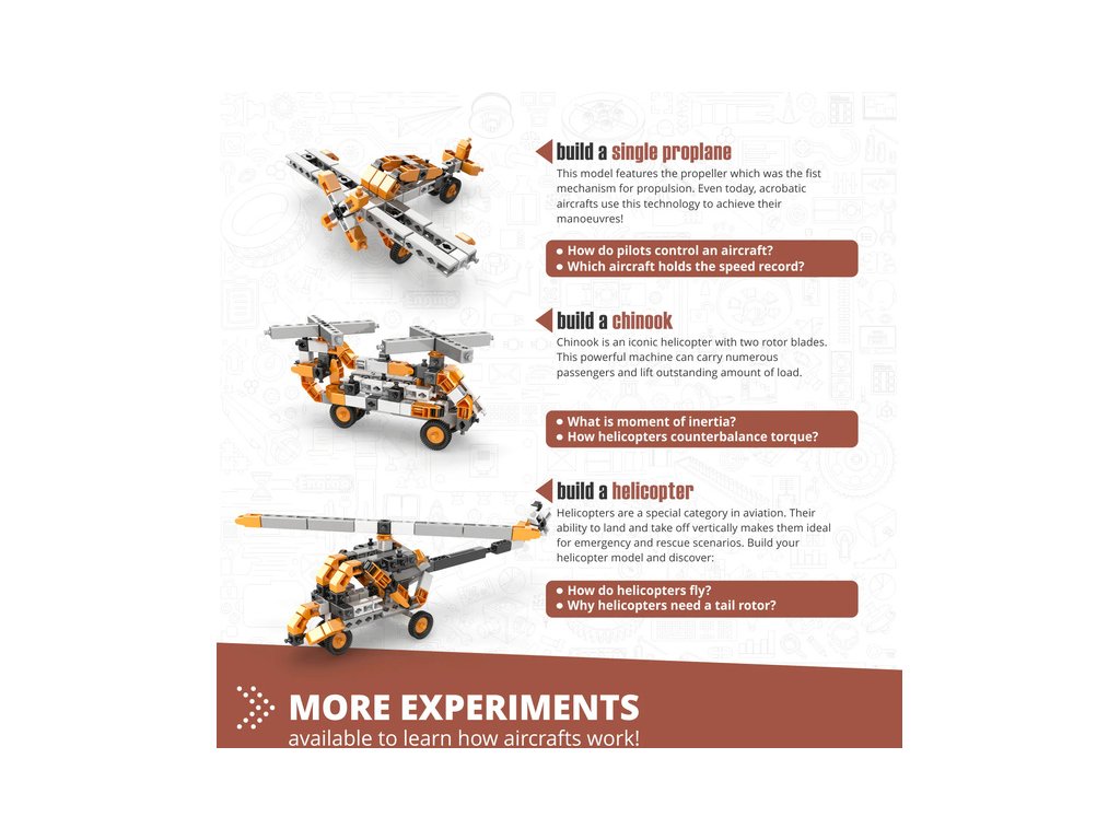 Děti se učí se STEM a během stavění modelů a experimentování se dozví odpovědí na otázky, jako kdo vynálezl letadelo, jak je piloti ovládají, jak létají vrtulníky, jaké síly ovlivňují let a další. Rozvoj letectva se považuje za jeden z vrcholů v historii lidstva, protože zcela změnil způsob, jakým cestujeme po Zemi.