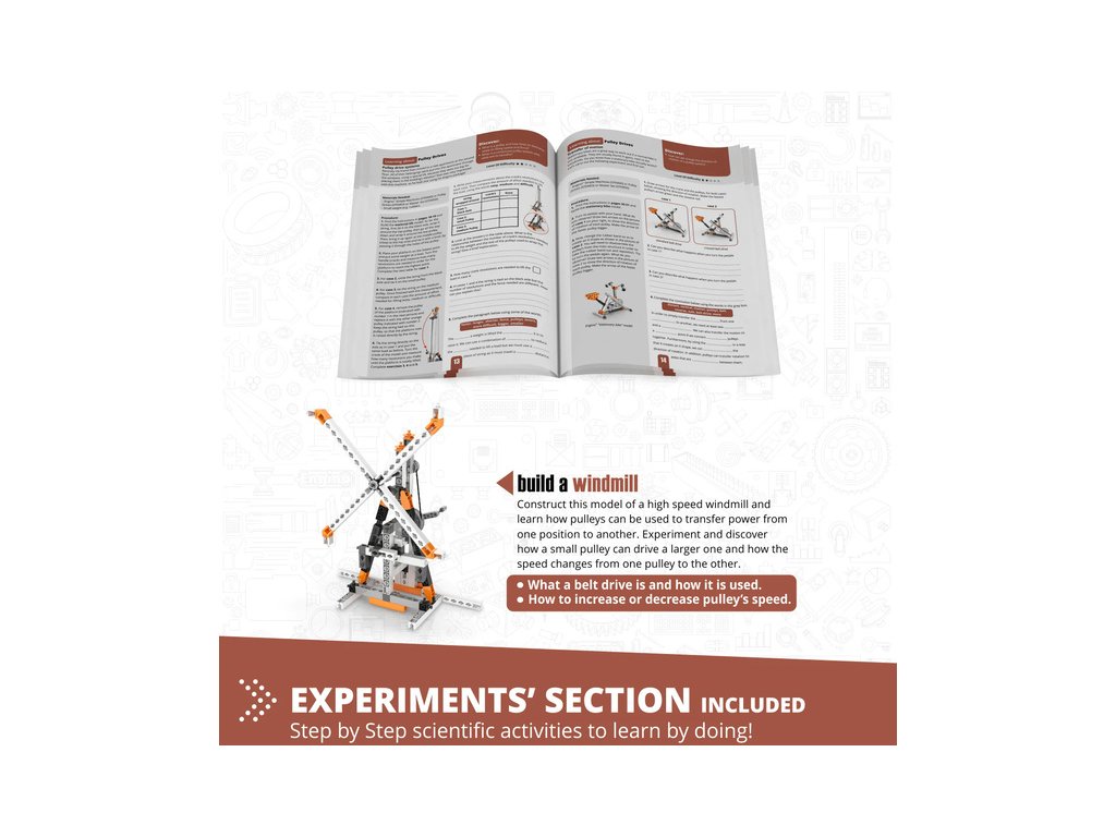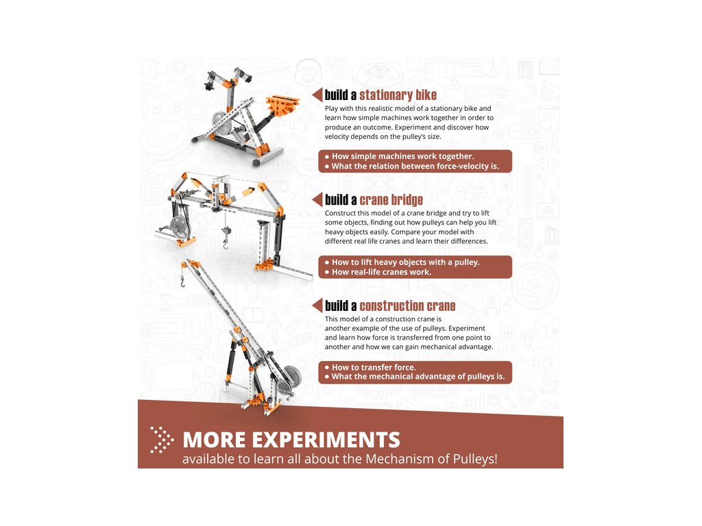 Zjistíte, jak lze řemenové pohony použít pro přenos síly se sníženým třením a jak mohou zvýšit sílu nebo rychlost. Kladky se používají již tisíce let a jsou nezbytnou součástí složitých strojů v moderní době, které řeší řadu technologických problémů. Postavte si 8 funkčních modelů, jako je tahání materiálu, stacionární kolo, jeřábový most, mixér, stavební jeřáb a větrný mlýn. Jednoduché pokyny pro sestavení všech modelů naleznete buď online, nebo v přiložené brožuře. Brožura poskytuje podrobné vysvětlení různých použitých vědeckých principů a zahrnuje inovativní experimentální aktivity pro praktické učení. K dispozici je také sekce Kvíz, ve které můžete otestovat své nově nabyté znalosti!