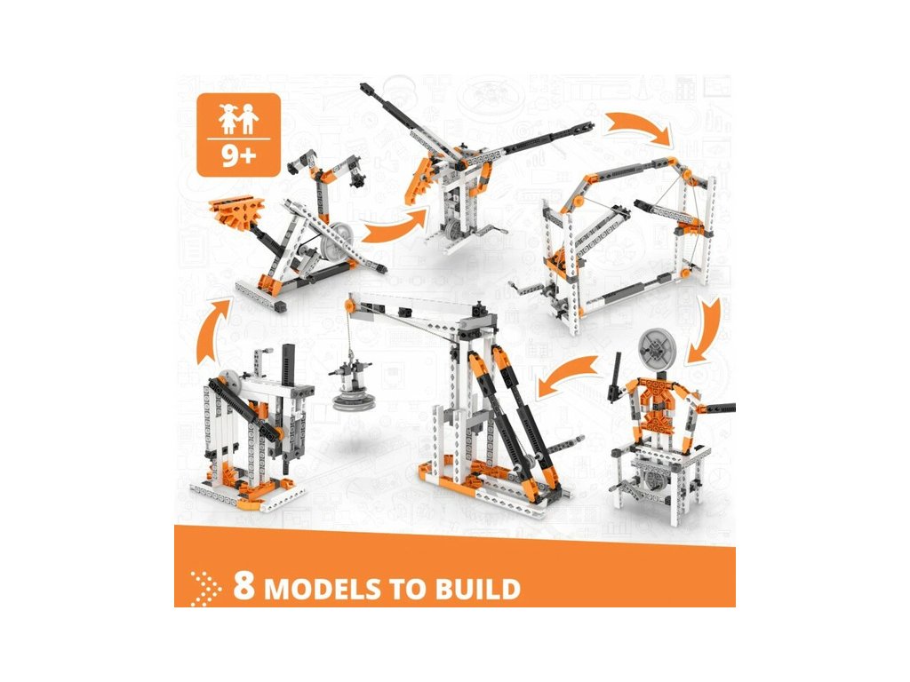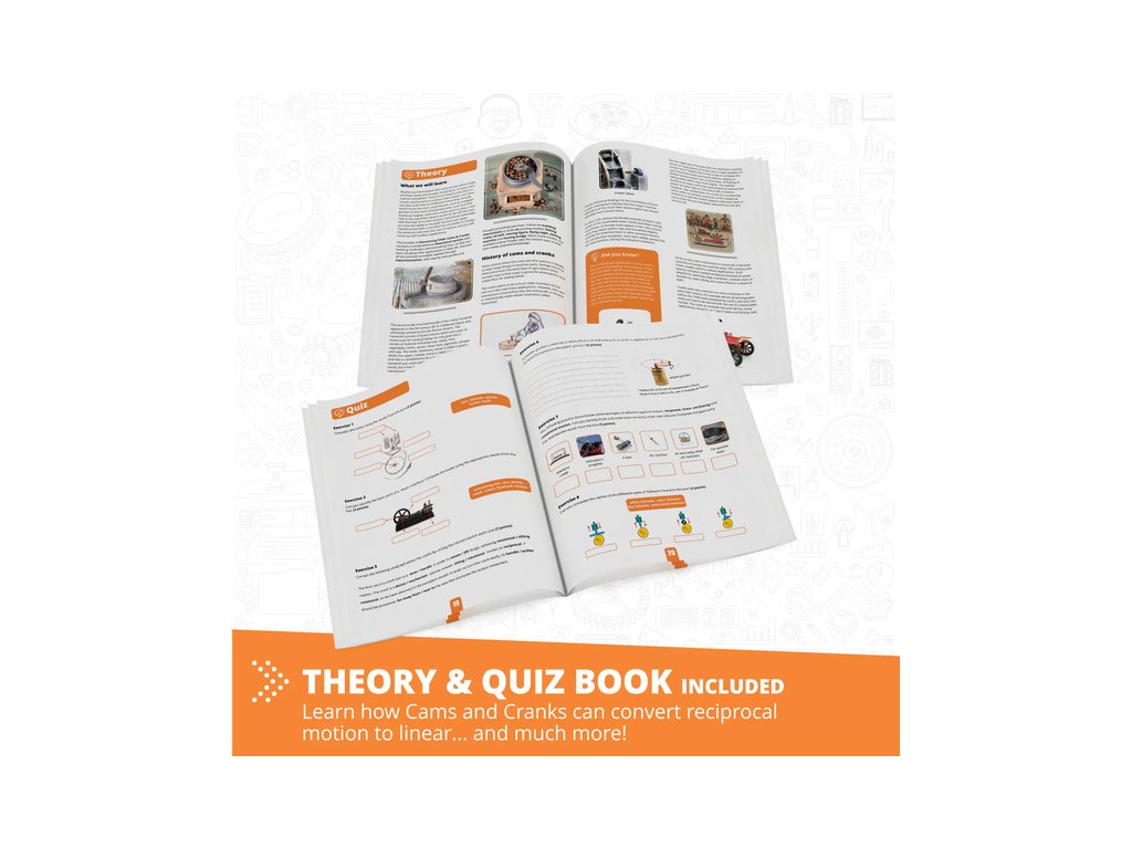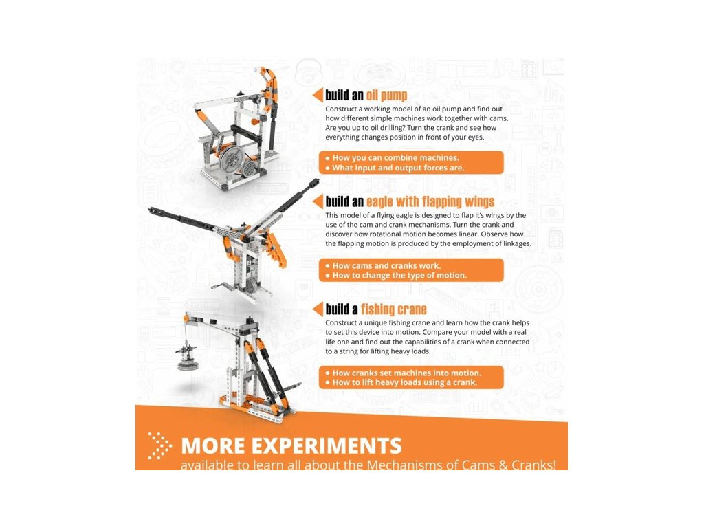 Zjistěte, jak můžete přenášet energii pomocí vaček a klik a jak je lze použít k převodu vratného pohybu na lineární. Zjistěte, jak jsou tyto mechanismy klíčovými prvky mnoha strojů, i když se nepovažují za „jednoduché stroje“. Postav si 8 funkčních modelů vaček a klik, jako je rybářský jeřáb, olejové čerpadlo, pohyblivá figurka, pohyblivý most, šicí stroj a létající orel. Jednoduché pokyny pro sestavení všech modelů naleznete buď online, nebo v přiložené brožuře. Brožura poskytuje podrobné vysvětlení různých použitých vědeckých principů a zahrnuje inovativní experimentální aktivity pro praktické učení. K dispozici je také sekce Kvíz, ve které můžete otestovat své nově nabyté znalosti!