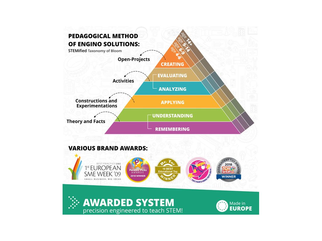 Engino pomáhá dětem rozvíjet kritické myšlení, prostorovou představivost a koordinaci ruka-oko již od 1.5 roku. Učí je spolupracovat, hledat řešení problémů a aplikovat teorii v praxi. Pro pedagogy i rodiče Engino nabízí kompletní výukový systém STEM, který pokrývá širokou škálu vědeckých principů a podporuje učení prostřednictvím hraní. Engino se pyšní bezpečností a ekologickými hledisky.