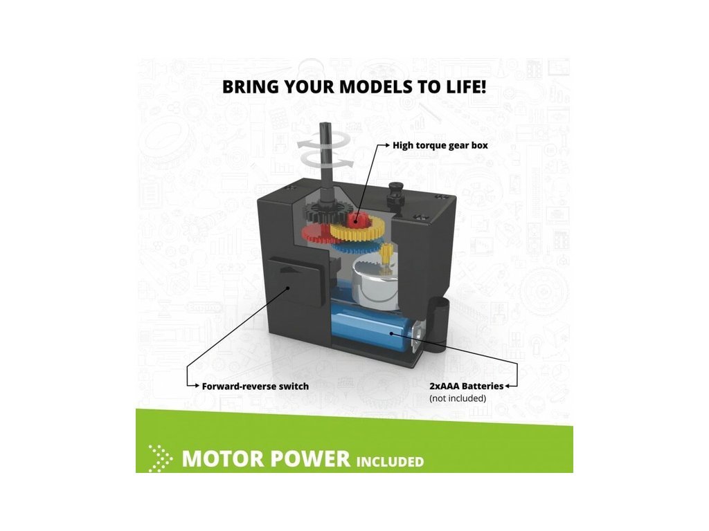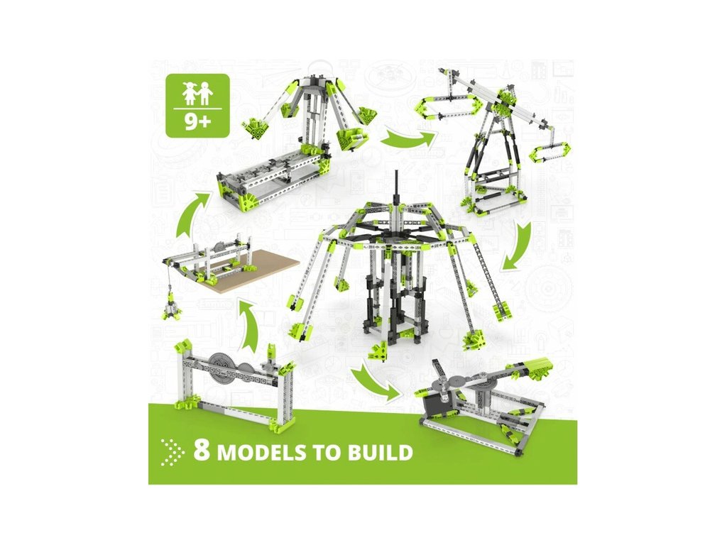 V zábavních parcích jsou hlavními atrakcemi vzrušující rychlé dráhy nebo romantická pomalá obří kola, která nabízejí nádherný výhled na okolí z výšky. Tato sada obsahuje jeden motor s převodovkou pro pohon čtyř velkých modelů takových jízd: ruské kolo, London Eye, kolotoč a posilovač. Kromě toho můžete experimentovat s ozubenými koly stavěním čtyř menších modelů, jako je převodovka, experimentální jeřáb, kolotoč a planetárium. Jednoduché návody na sestavení všech modelů naleznete buď online, nebo v přiložené brožuře. Brožura poskytuje podrobná vysvětlení různých použitých vědeckých principů a zahrnuje inovativní experimentální aktivity pro praktické učení. K dispozici je také sekce Kvíz, ve které můžete otestovat své nově nabyté znalosti!