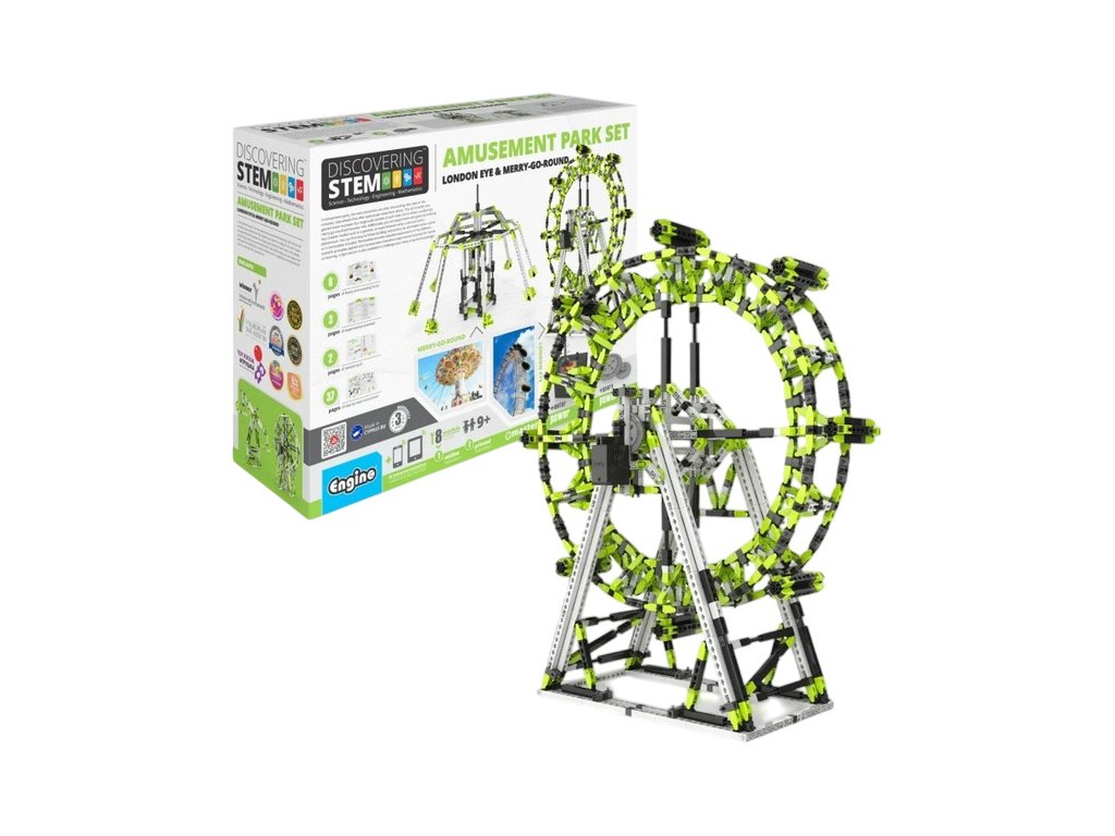 Zábavné výukové stavebnice Engino Stem Zábavní park London Eye a kolotoč, postavte si dva velké modely, slavné vyhlídkové Oko (Eye) v Londýně a kolotoč! Tato sada obsahuje i motor s převodovkou pro pohon. Můžete experimentovat s ozubenými koly stavěním čtyř menších modelů. Vhodné pro věk 9+.