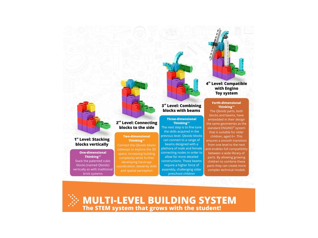 Kostyk Engino se dělí do 4 subsystému podle věku. Baby Qboidz zaměřené na bezpečnost a rozvoj motorických schopností od 1.5 roku. Qboidz od 3 let přidává některé speciální spojovací prvky a zaměřuje se na kognitivní rozvoj. Engino Classic což jsou originální původní kostky pro děti od 6 let, umožňující komplexní stavbu ve více osách. Engino Mechanics od 9 let s technickými díly jako jsou převody a ozubená kola.