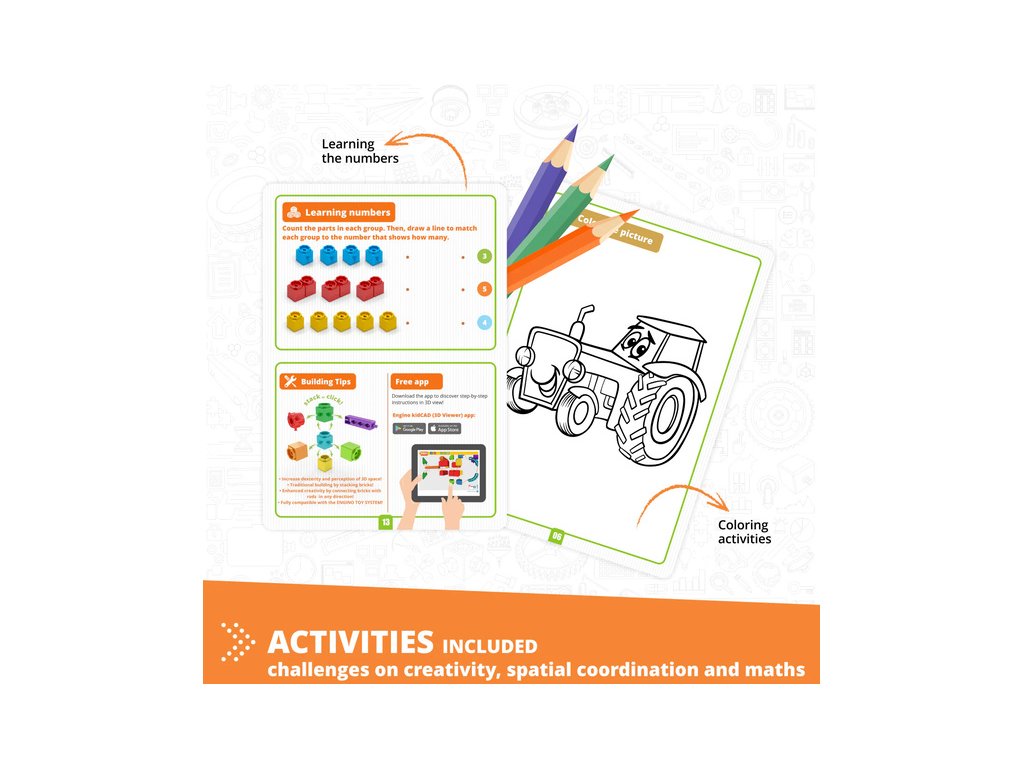 Když dokončí stavění, děti si mohou vzít si do ruky pastelky a ozdobit si svá vozidla. Děti navíc získají: plnobarevnou brožurku s neobvyklými fakty o jejich oblíbených vozidlech, tvůrčí umělecké aktivity, jako jsou spojování teček, vybarvování a bludiště, zábavná cvičení pro párování a počítání, super jednoduché návody na stavění pro malé ručičky a tvůrčí mysl.