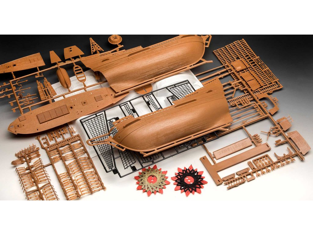 Plastový model (nesestavený), ilustrovaný vícejazyčný návod na sestavení, sada obtisků, barvy (Revell Aqua Color), štětec, provázek, lepidlo (Revell Contacta Professional Mini), plakát, 5 figurek posádky