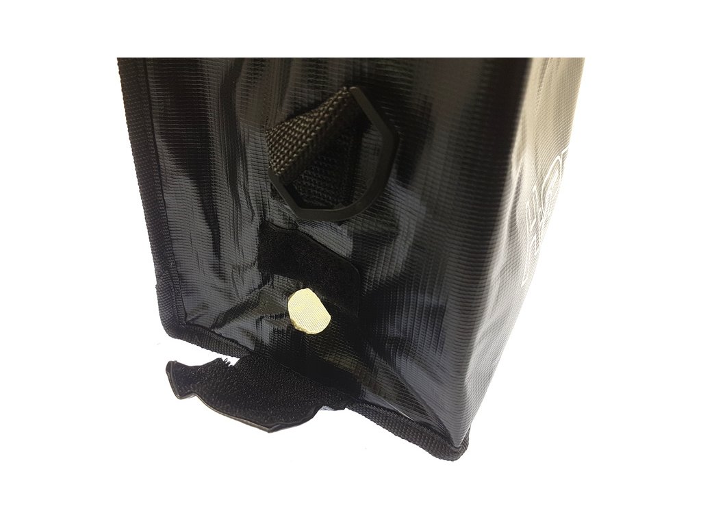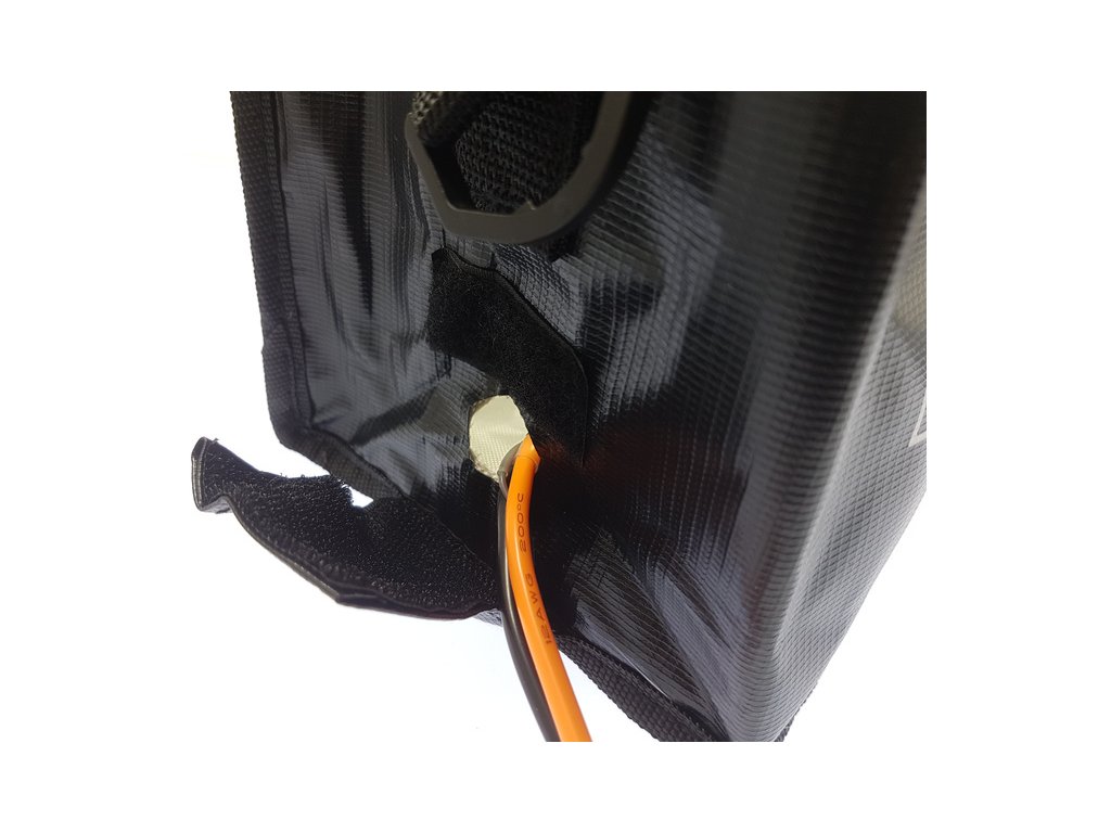Na boční straně ochranného obalu je otvor, kterým lze protáhnout kabely akumulátorů pro bezpečné nabíjení uvnitř. Po skončení nabíjení lze otvor uzavřít pomocí pásku se suchým zipem.