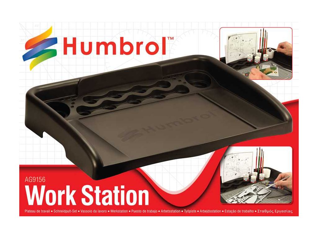 Pracovní stanice Humbrol má mnoho funkcí: - Dvojitá hloubka sekcí pro uložení 9 x 14ml/12ml nádobek s emailem nebo akrylem Humbrol nebo 3ml nádobek s akrylem Humbrol Dvojitá hloubka držáků na kelímky s vodou, která modeláři umožňuje umístit 28ml produkty Humbrol, jako např: Navrženo tak, aby se do pracovní plochy vešla řezací podložka Humbrol A4 (AG9155).Dvě míchací plochy po obou stranách řezací podložky. Držák návodu A4. držáky štětců a nástrojů. snadno uchopitelné rukojeti na obou stranách pracovní stanice. Gumové nožičky, které modeláři umožňují umístění na rovný povrch.