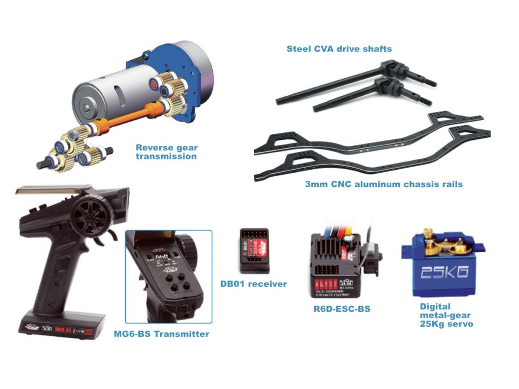 Podvozek má dělenou konstrukci převodovky s reverzní rotací hnacích hřídelí, pohon všech kol a motor umístěný vpředu pro stabilitu. Přesnost řízení je zajištěna servem umístěným na nápravě s Panhardovou tyčí pro pozitivní Ackermann úhel řízení.