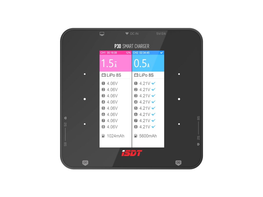 Vysokovýkonný dvoukanálový nabíječ ISDT P30 1500W je inteligentní nabíječ s napájením z autobaterie nebo výkonného stabilizovaného síťového zdroje a velmi jednoduchou a přehlednou obsluhou. P30 umožňuje nabíjet a vybíjet běžné typy článků (NiCd, NiMH, LiPo, LiHV, ULiHV, Li-ion, LiFe, Pb), navíc je vybaven vestavěnými osmikanálovými balancery, které zajišťují bezpečné nabíjení lithiových akumulátorů. Nabíječ je vybaven barevným LCD displejem a dotykovými programovacími tlačítky, které vám poskytnou možnost komfortního a velice přehledného nastavování parametrů, řízení a sledování průběhu nabíjení.