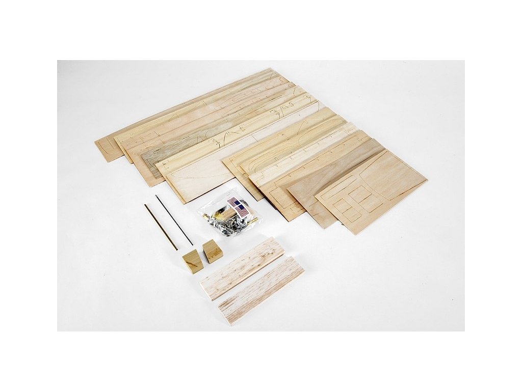 Stavebnice obsahuje: předseknuté překližkové díly trupu, balsové plaňky na obšívku, vakuově lisované plastové díly nástavby, smrkové a plastové nosníky a tyčinky, odlévané kovové díly a další maketové příslušenství, elektromotor 4,8 V, lodní hřídel s pouzdrem a dvoulistým šroubem 25 mm, stavební plán obsahující třípohledový výkres lodi a perspektivní nákresy jednotlivých kroků stavby, návod ke stavbě.