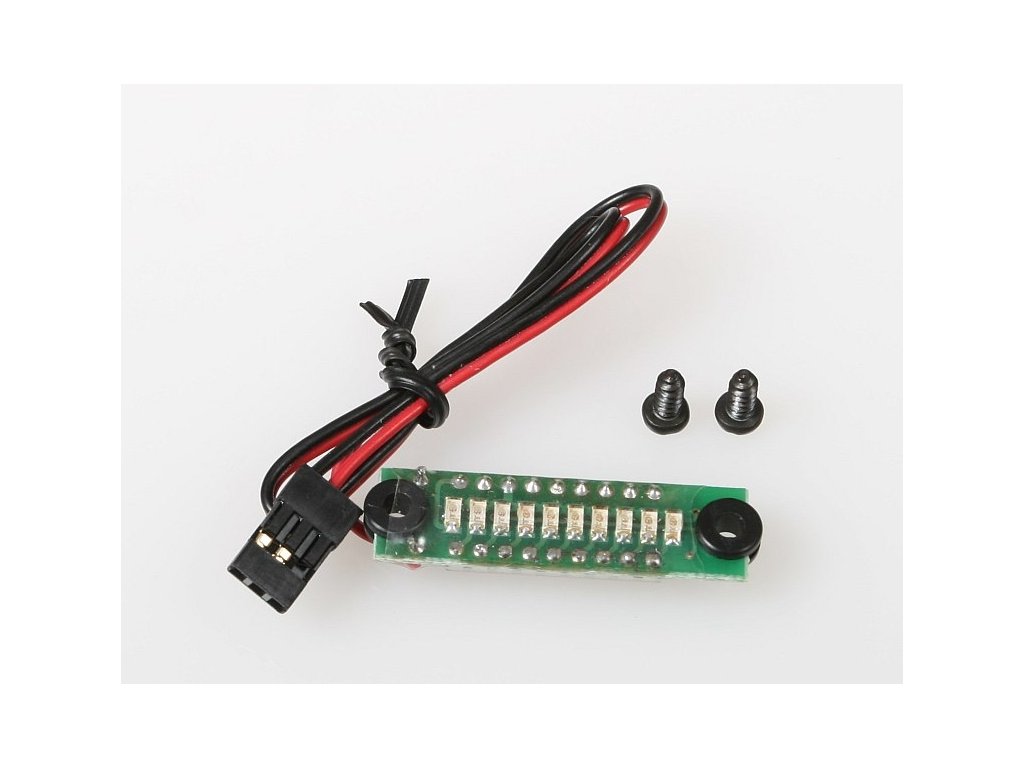 Sloupcový indikátor napětí ("běžící bod") pro Ni-XX akumulátorové sady se 4 články s 10 LED. Indikátor se napájí z měřeného akumulátoru, je vybaven patkami s gumovými průchodkami pro přišroubování na vhodné místo modelu.