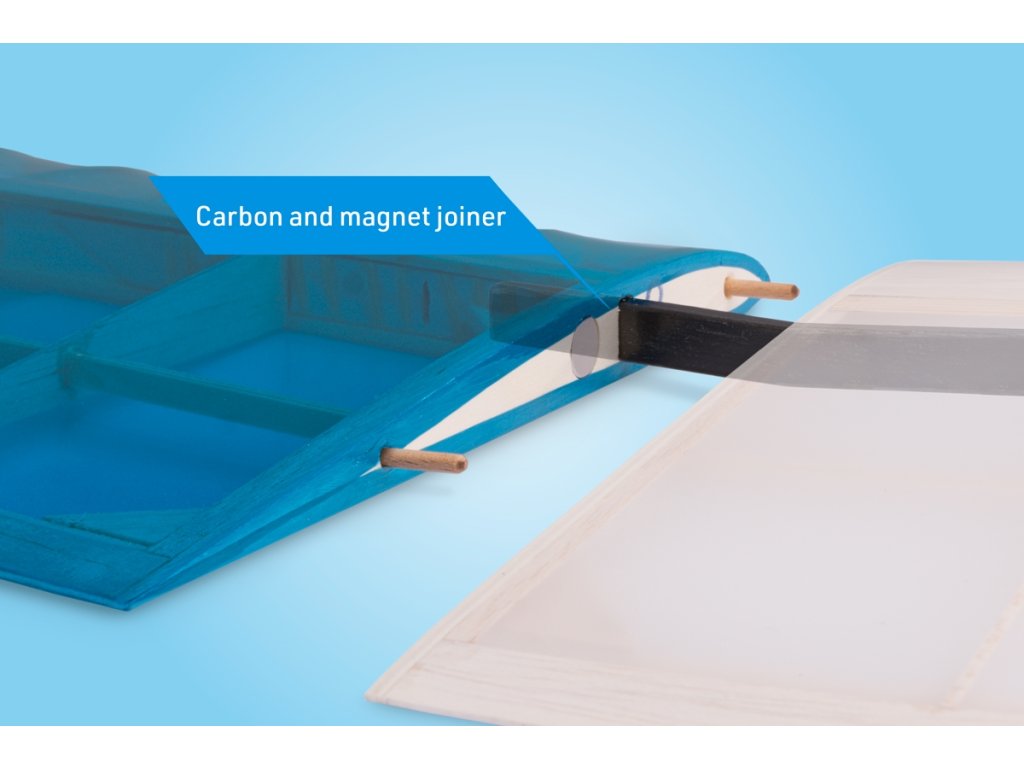 Trojdílné křídlo se speciálním profilem HB RES je klasické konstrukce s balsovými žebry a tuhým potahem torzní skříně na centroplánu. Hlavní nosník je tvořen pásnicemi ze smrkových lišt s balsovou stojinou, což zaručuje vysokou pevnost kostry při velmi nízké hmotnosti. Uši s elegantními winglety se k centroplánu připojují uhlíkovými spojkami a bukovými kolíky s magnety jako pojistkami. V centroplánu je umístěna dvoudílná výklopná aerodynamická brzda – tu doporučujeme nevynechat, zvláště pokud stavíte „čistý“ větroň. Ovládá se jedním servem prostřednictvím torzního náhonu z uhlíkové tyčky s laminátovými pákami. K trupu se křídlo upevňuje plastovým šroubem.
