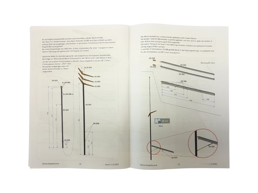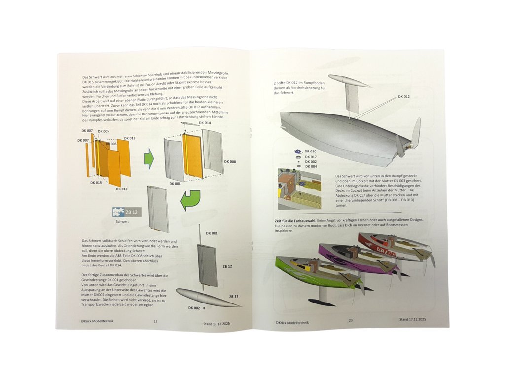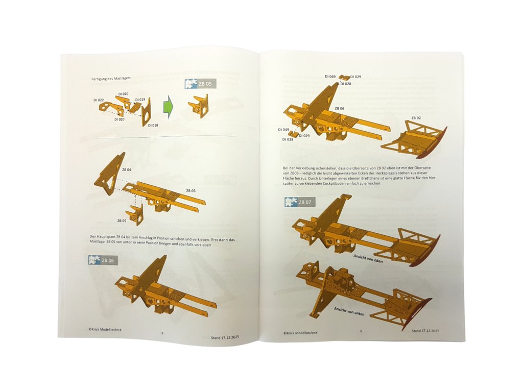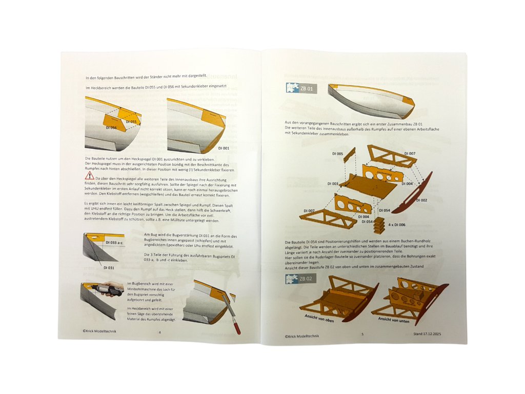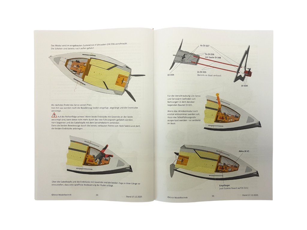 Set obsahuje kompletní obrazový návod s obrázky jednotlivých kroků stavby. V návodu je kromě stavby a sestavení takeláže obsažen i postup zástavby elektronikou.