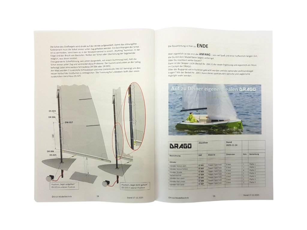 Stavebnice je koncipována jako kompletní sada, která obsahuje celé oplachtění s karbonovým (CFK) stěžněm, ráhnem, předřezanými plachtami a všemi potřebnými díly k sestavení takeláže. Protože model nemá samoobratnou kosatku, jsou pro RC provoz nutné alespoň dva navijáky plachet, které nezávisle ovládají kosatku a hlavní plachtu. Vysoce kvalitní trup z GFK a laserem vyřezané a gravírované překližkové díly tvoří pevný základ stavebnice, díky čemuž je její sestavení poměrně snadné a rychlé. 3D tištěné kování a charakteristická různobarevná lana v otevřené palubě dodávají modelu velmi realistický vzhled. Stylizovaný drak, který dal modelu jméno, se vine po boku trupu ve formě samolepicí fólie a činí z DRAGO skutečně nápadný a působivý model.