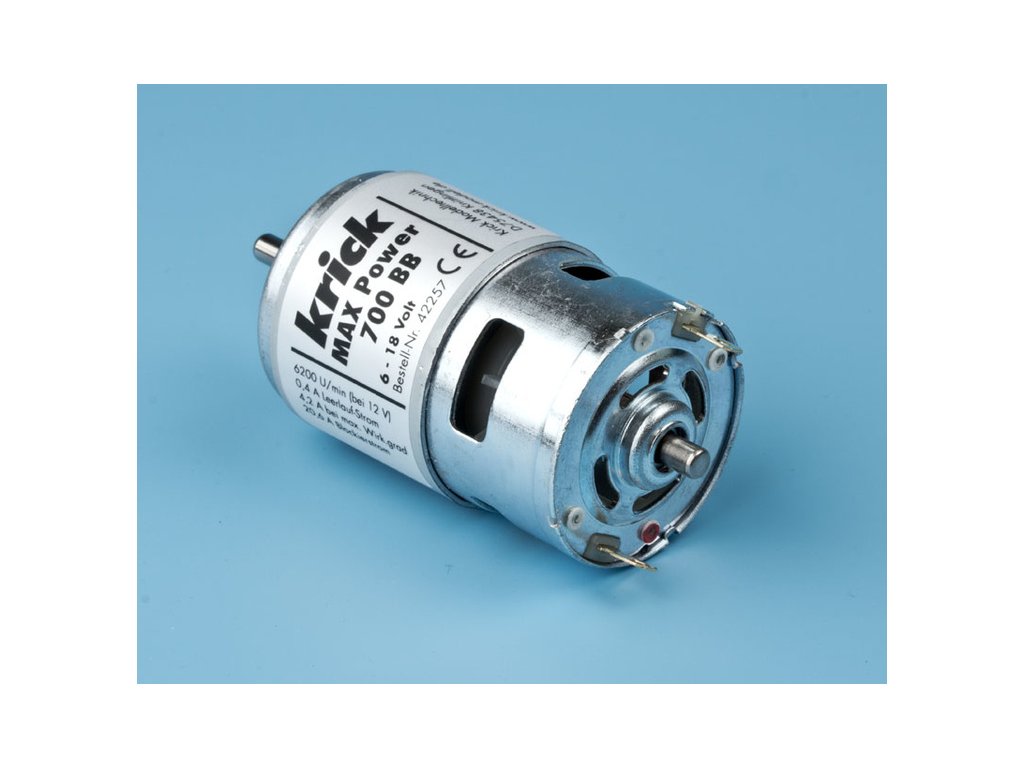 Krick Motor MAX Power 700 BB je stejnosměrný univerzální elektromotor řady 700 s vysokým točivým momentem, kuličkovými ložisky a vnitřním ventilátorem. Celkový rozměr Ø44 x 98 mm, hřídel Ø 5 mm, jmenovité napájecí napětí 12 V, proud do 20,6 A, hmotnost 340 g.