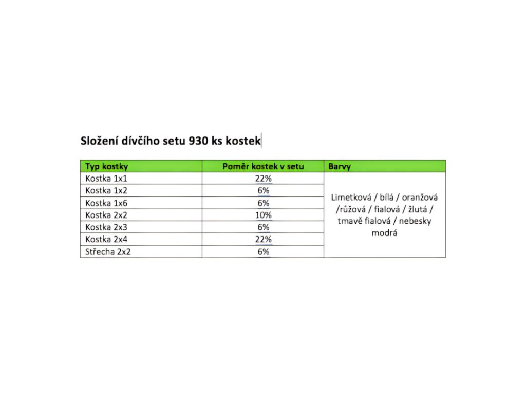 Sada základních stavebních kostek v pestrých dívčích barvách, které probouzí fantazii ke stavbě neobyčejných sídel, zámků, domků a pokojů. Baleno v průhledném plastovém sáčku.
