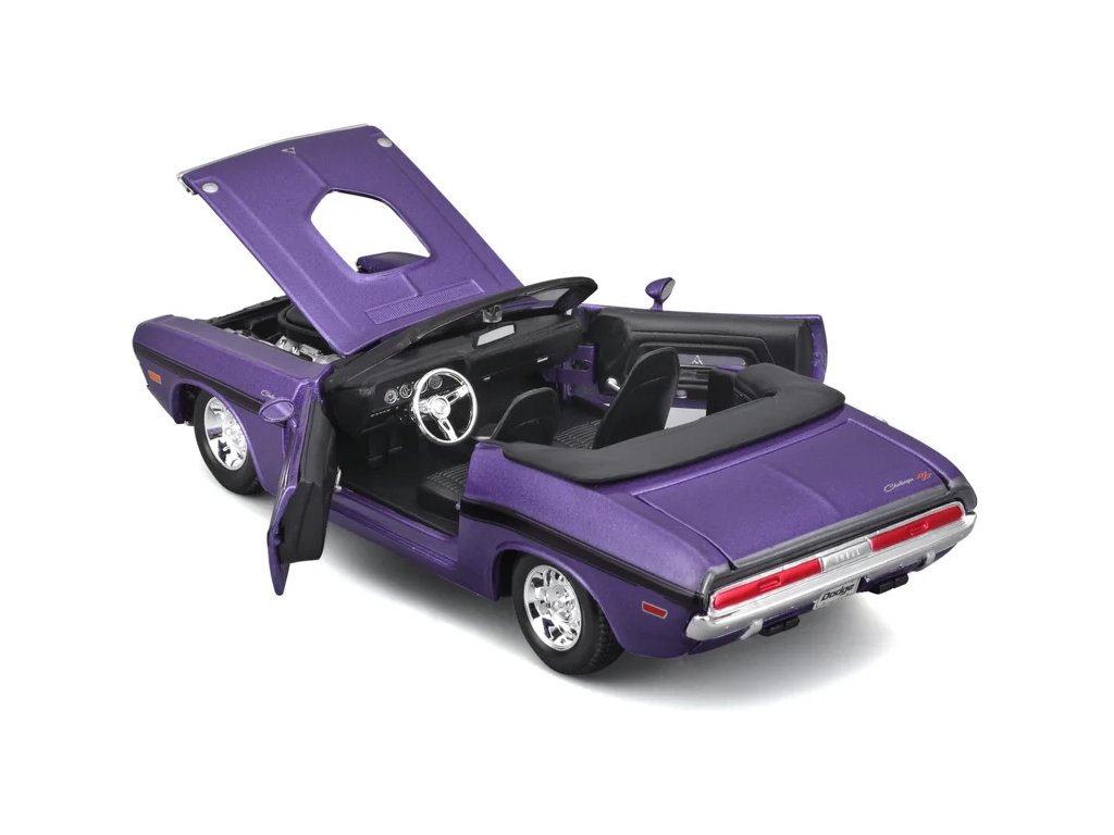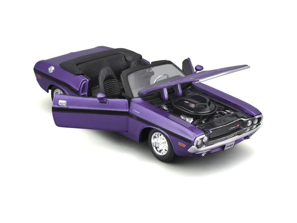 Kovový model auta 1:24 Maisto 31264 Dodge Challenger R/T Convertible 1970 nejen pro sběratele. Model je v detailním provedení a má otevíratelné dveře. Barva modelu je fialová metalíza a je přibližně 17 cm velký.