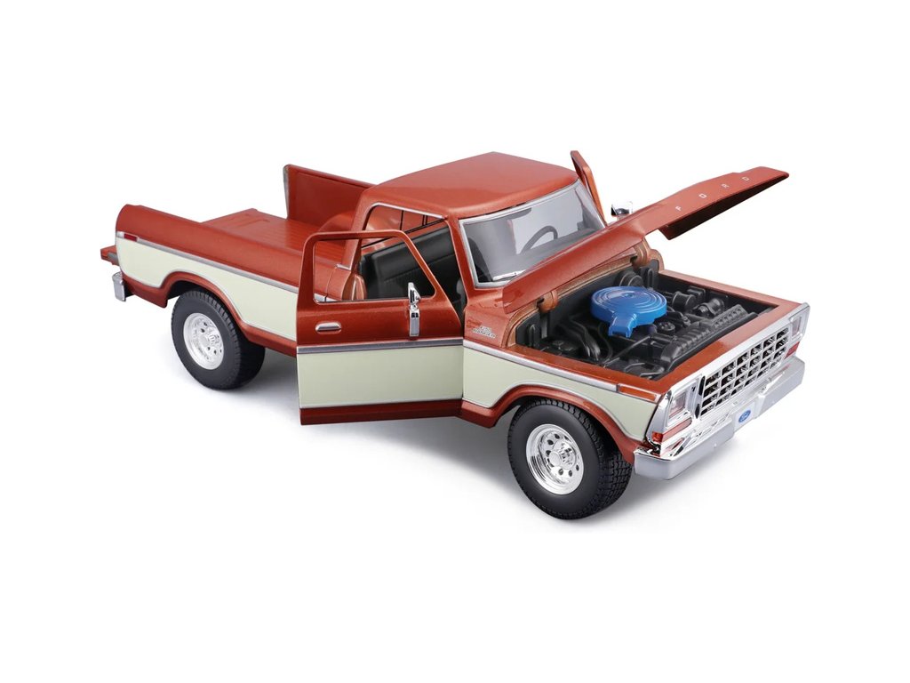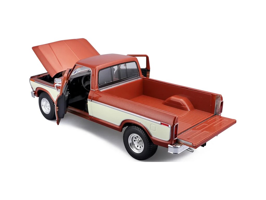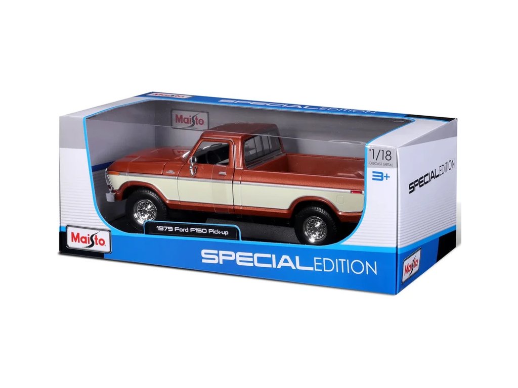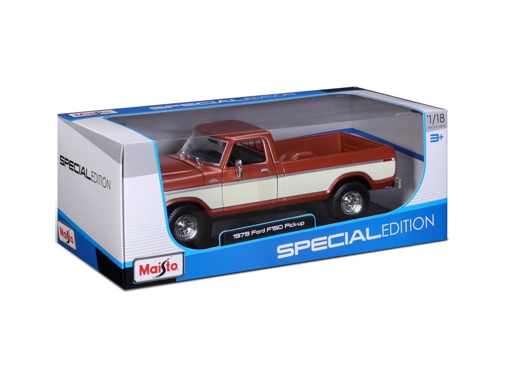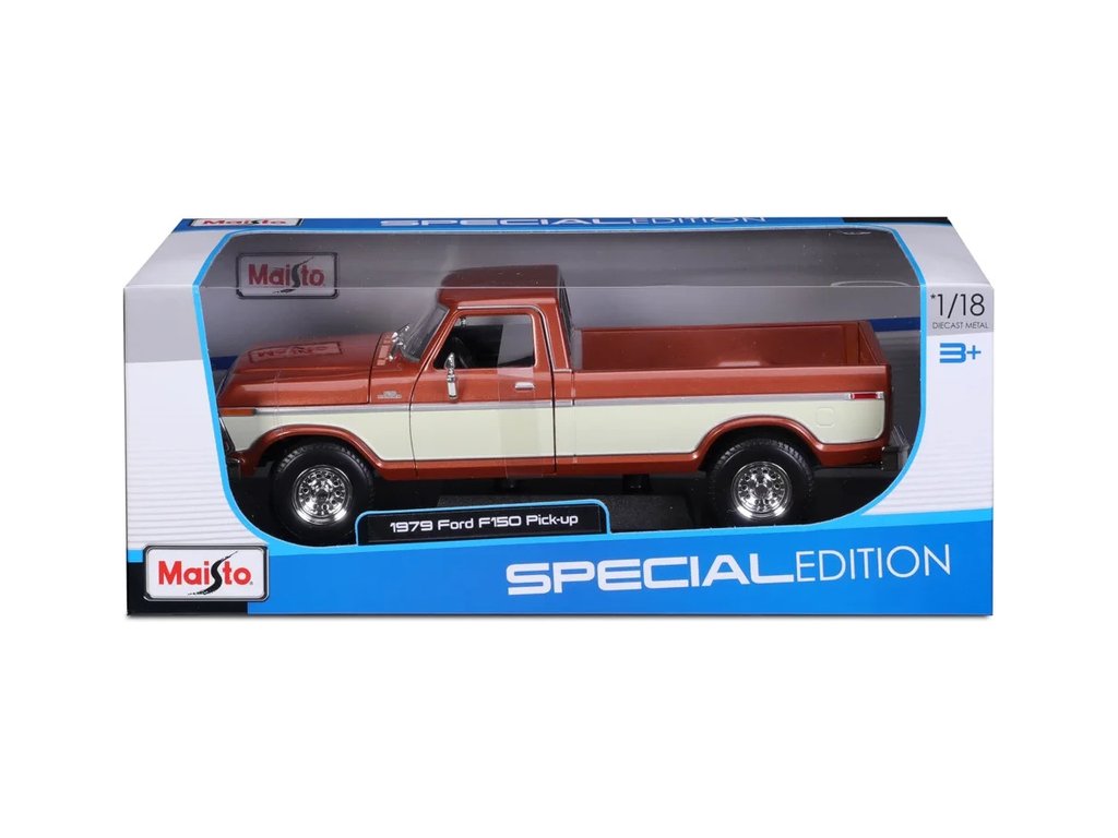 Kovový model auta 1:18 Maisto 31462BR Ford F150 Pick-up 1979 nejen pro sběratele. Model je v detailním provedení a má otevíratelné dveře. Barva modelu je hnědá metalíza a je přibližně 27 cm velký.