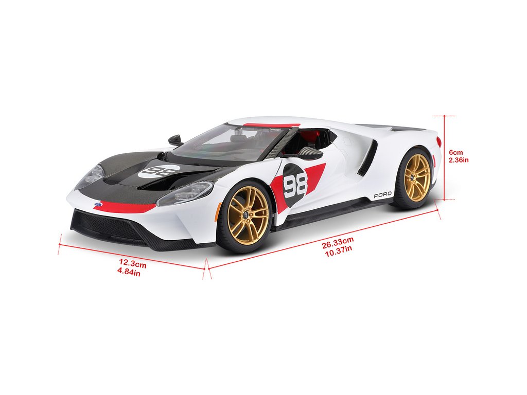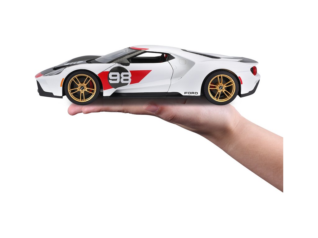 Kovový model auta 1:18 Maisto 31390 Ford GT 2021 #98 Heritage Edition nejen pro sběratele. Model je v detailním provedení na plastovém podstavci. Model je v černobílé barvě se závodním číslem.