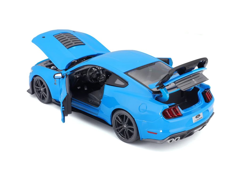Kovový model auta 1:18 Maisto 31452B Ford Mustang Shelby GT500 2020 nejen pro sběratele. Model je v detailním provedení a má otevíratelné dveře. Barva modelu je modrá a je přibližně 27 cm velký.