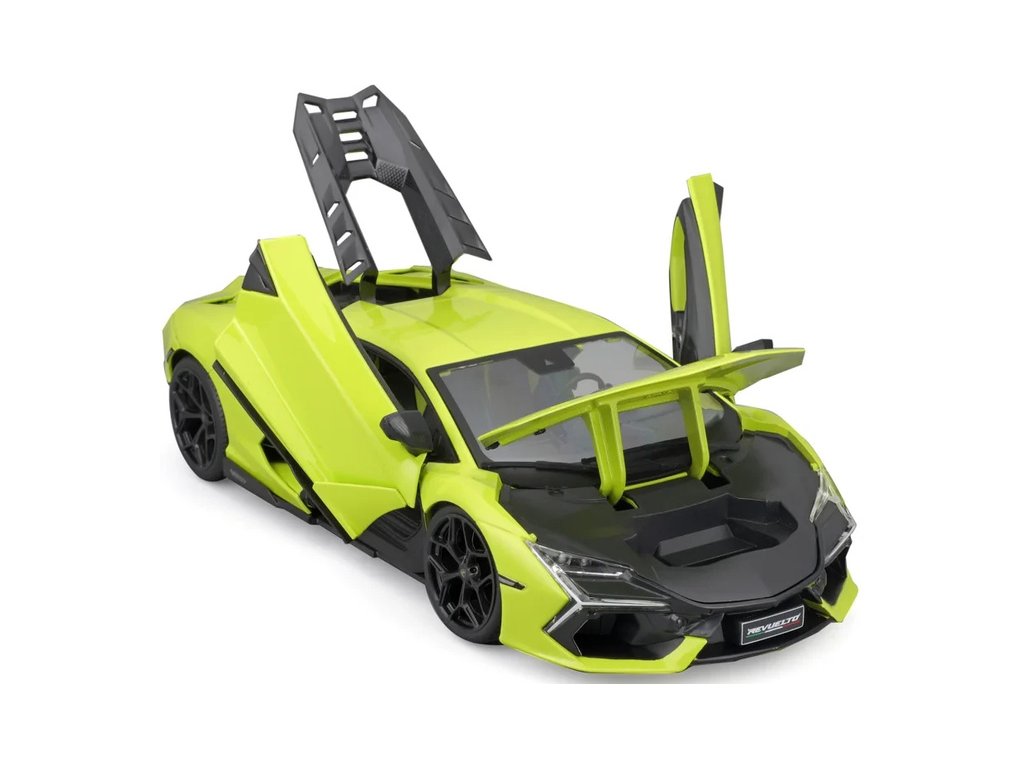 Kovový model auta 1:18 Maisto 31463O Lamborghini Revuelto nejen pro sběratele. Model je v detailním provedení a má otevíratelné dveře. Barva modelu je zelená a je přibližně 27 cm velký.