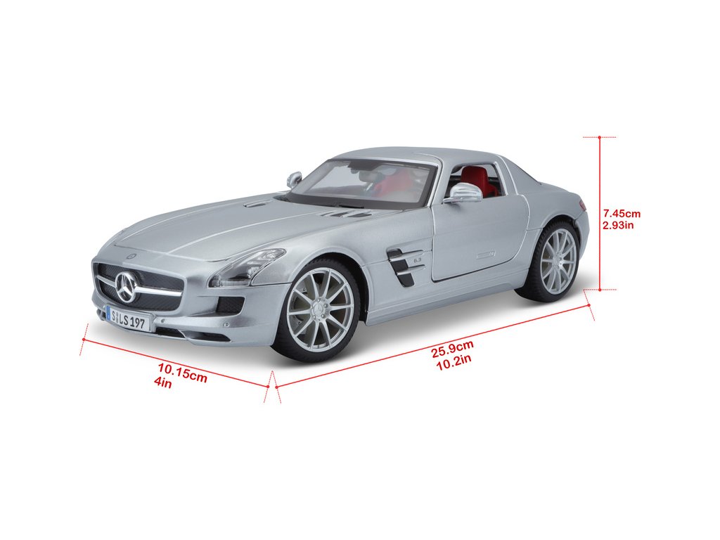 Kovový model auta 1:18 Maisto Mercedes-Benz SLS AMG nejen pro sběratele. Model je v detailním provedení na plastovém podstavci. Barva modelu je stříbrná
