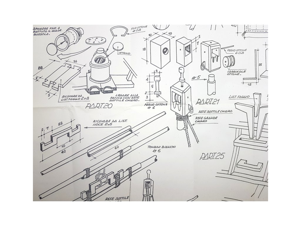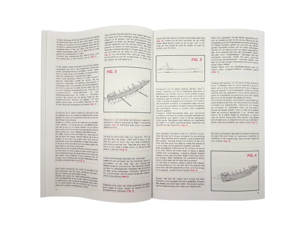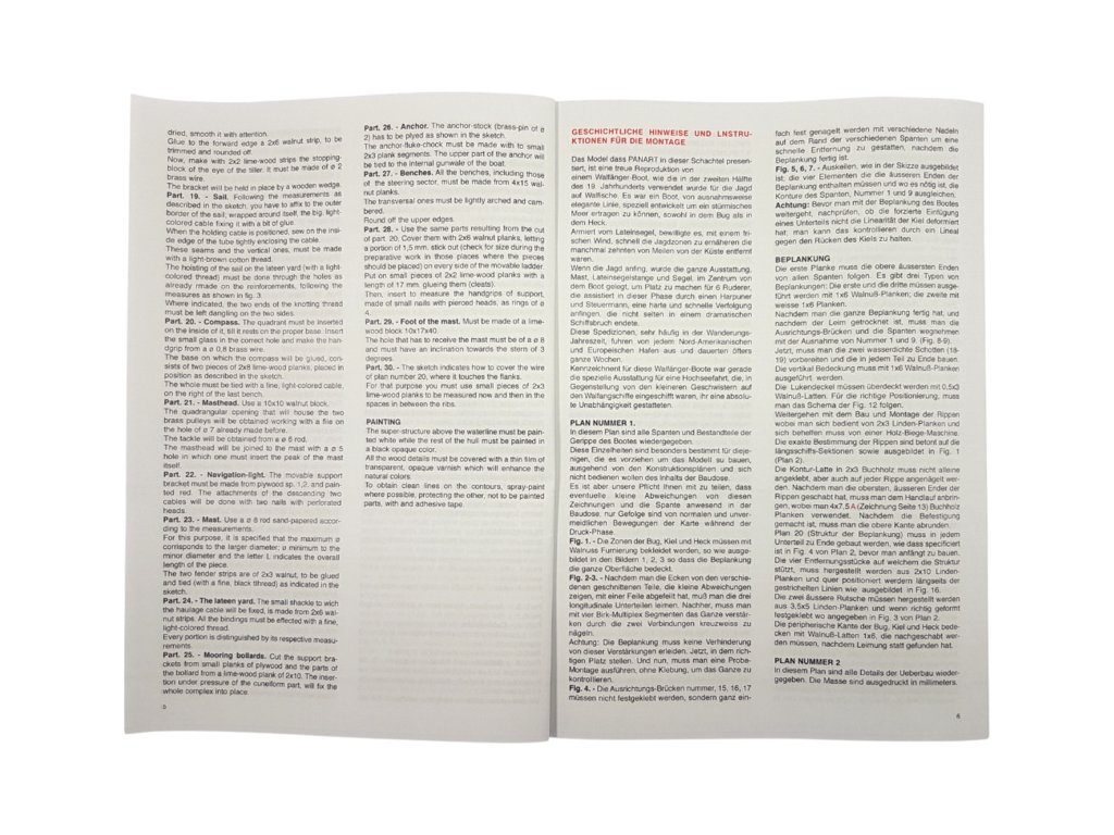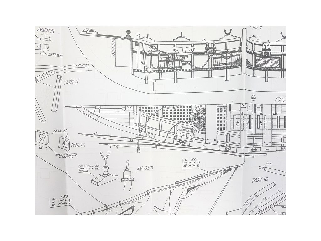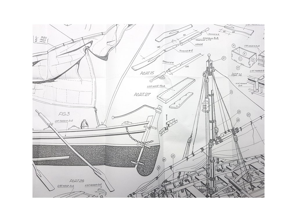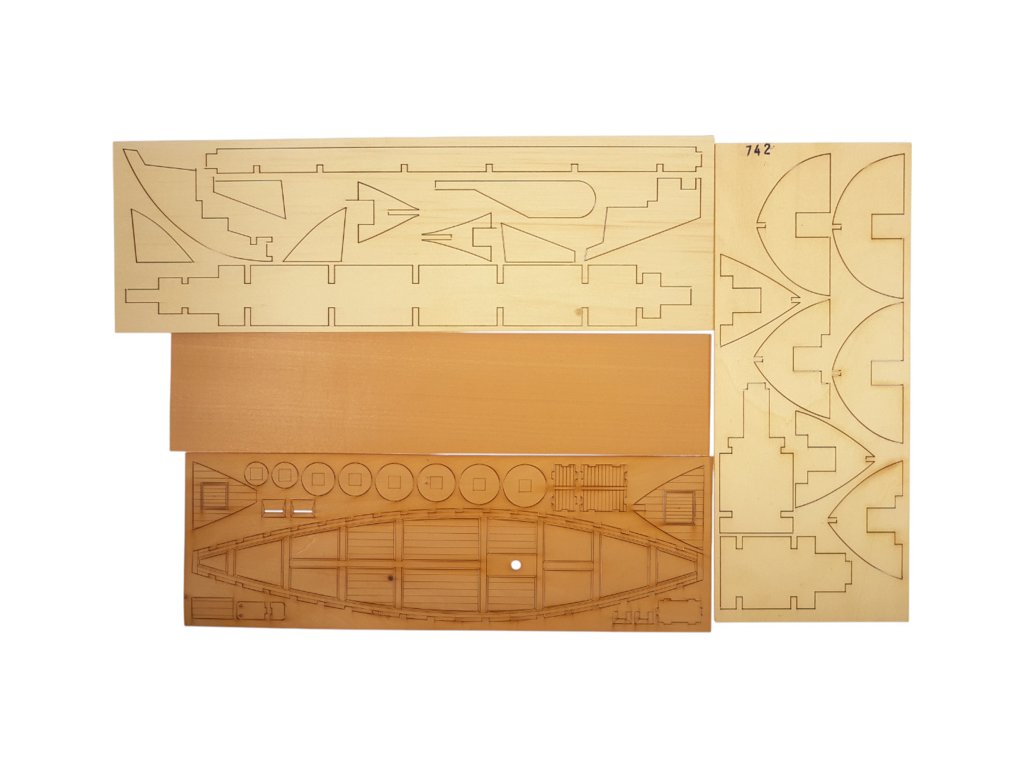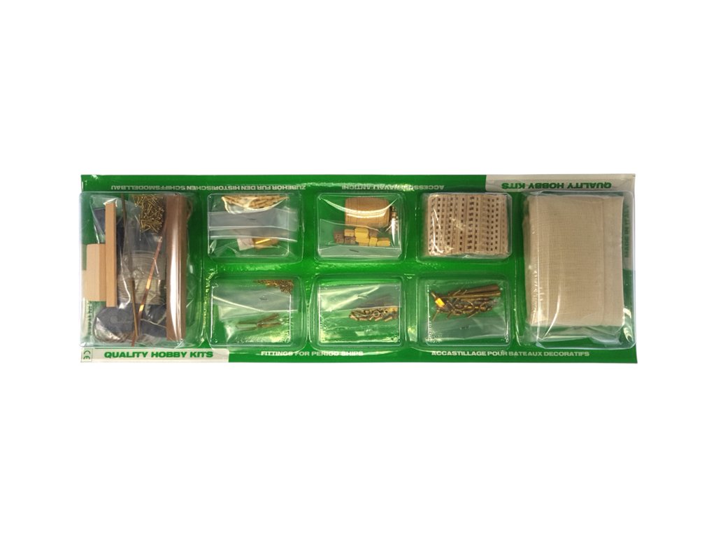 Balení obsahuje laserem řezané dřevěné díly, plaňky a lišty, stožáry, lanoví, plachtovinu, drobné dřevěné díly, mosazné odlitky a kovové díly. Stavební plány, manuál.