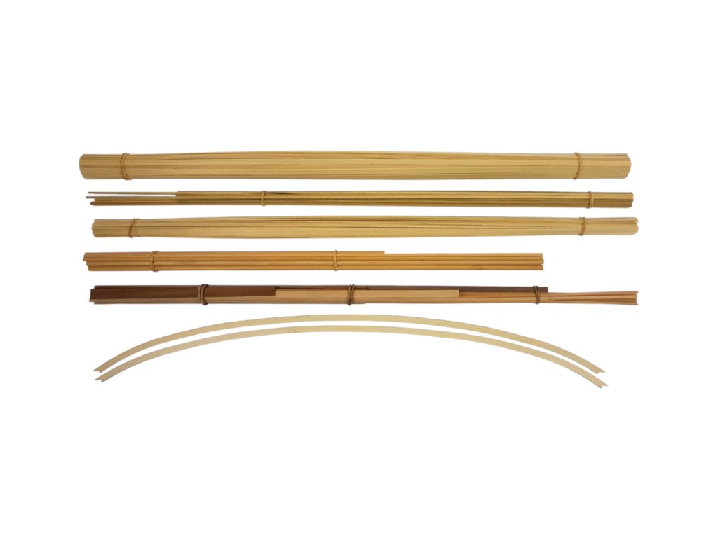 Po otevření víka krabice naleznete uspořádané překližkové díly, lišty a stožáry jsou svázány ve svazcích, drobné díly jsou baleny v blistru.