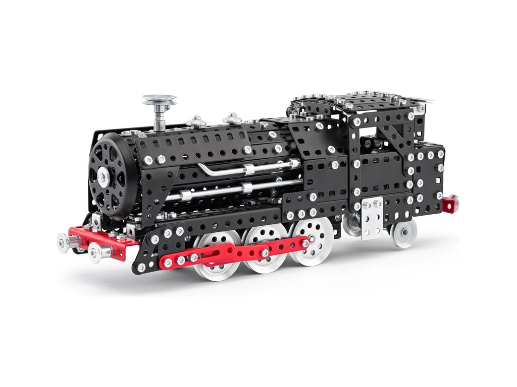 Klasická česká stavebnice Merkur - Lokomotiva. Kovový model v ikonické černé barvě s červenými prvky. Pohyblivá kola a spojnice. Kabina strojvedoucího, detaily parních trubek, komín, písty, přední reflektory, spřáhla. Merkur díly jsou univerzální a tak vás neomezí v jakékoli modifikaci a nápadu. Stavebnici tak můžete sestavit podle návodu nebo podle svých představ.