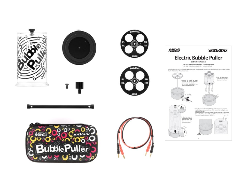 MIBO Elektrický odstraňovač bublin je praktickým nástrojem pro každého RC závodníka. Byl navržen tak, aby stisknutím tlačítka vytvořil vakuum a vytáhl veškeré vzduchové bubliny z oleje ve vašich tlumičích, nebo diferenciálu. Stačí jen připojit zdroj, nebo baterii a jste téměř hotovi.