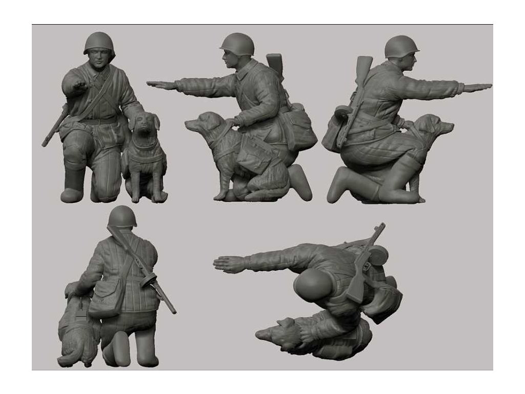 Sada dílů pro sestavení 3 figurek vojáků a 3 figurek psů.