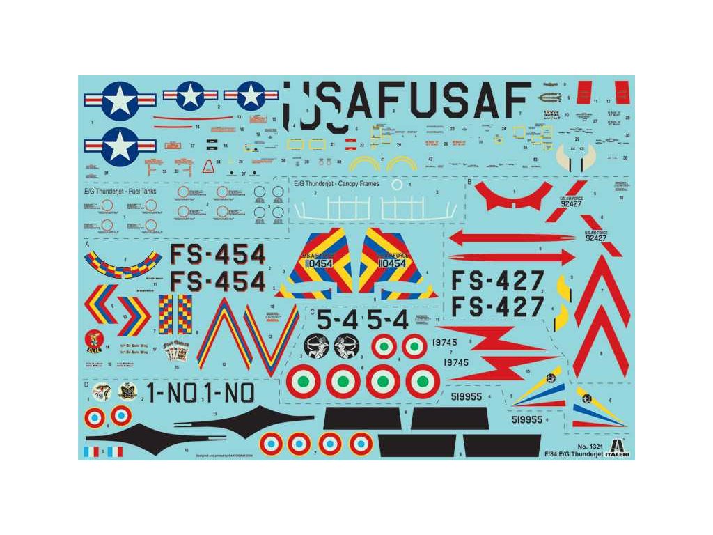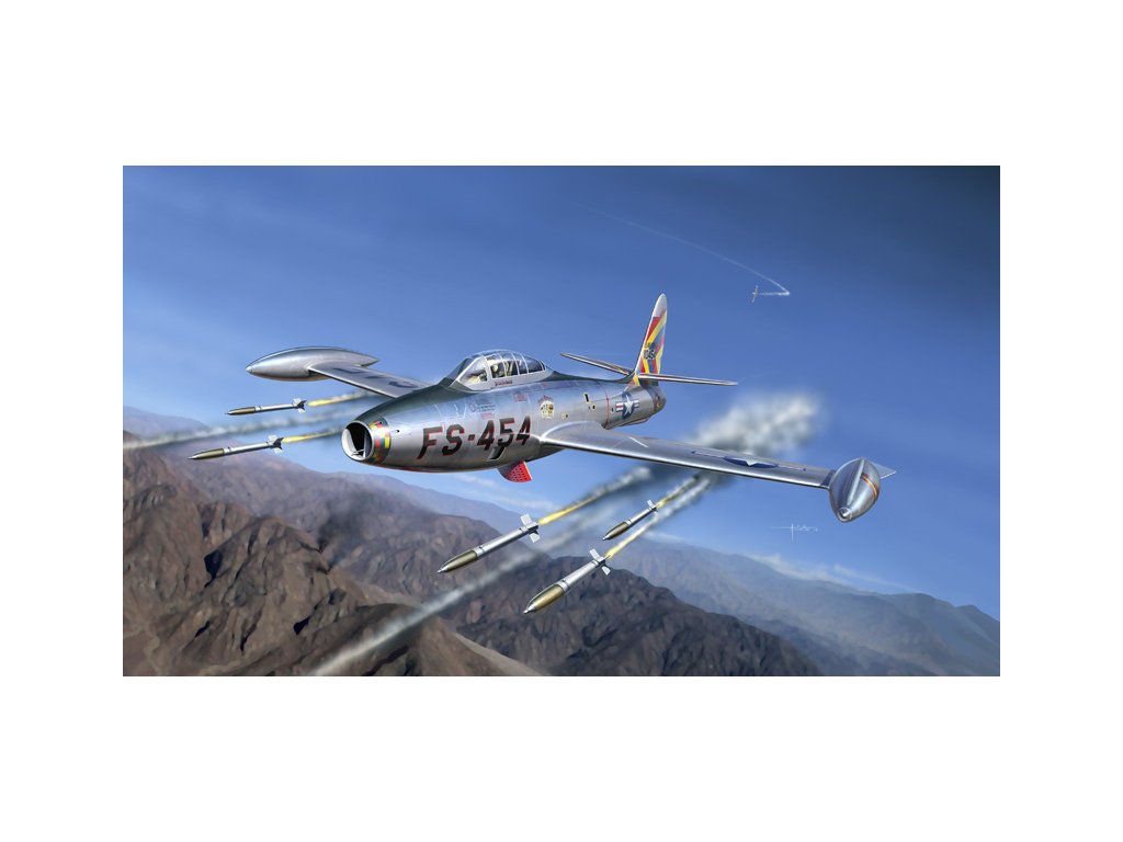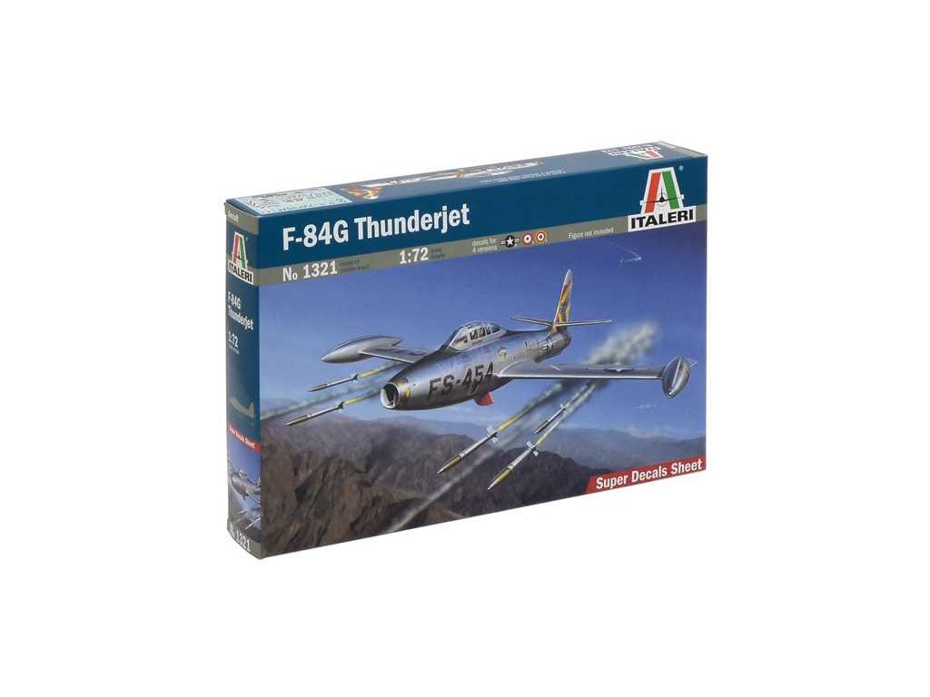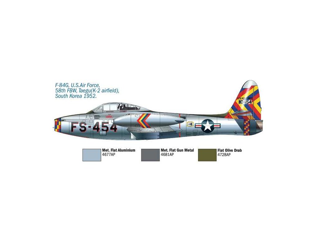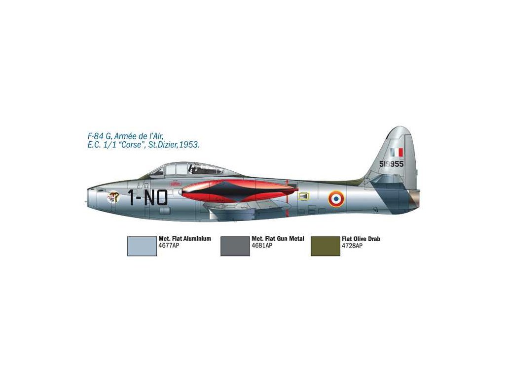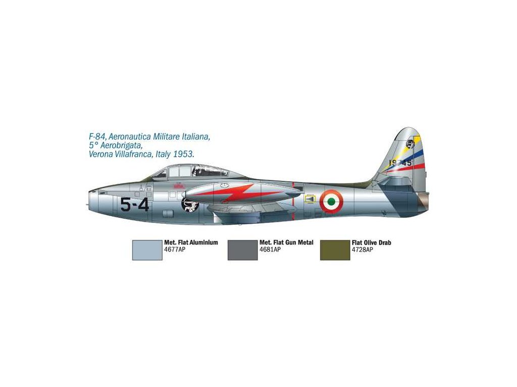 F-84 Thunderjet byl vyvinut v bezprostředním poválečném období americkou společností Republic, jejímž cílem bylo poskytnout americkému letectvu nový stíhací bombardér s proudovým pohonem. Jeho aerodynamická konstrukce byla jednoduchá, ale velmi efektivní a robustní, s velkým kruhovým předním přívodem vzduchu, rovnými křídly a tříkolovým podvozkem s příďovým kolem. Motor General Electric/Allison J35 umožňoval F-84 dosáhnout rychlosti až 1 000 km/h. F-84G, který byl uveden do výroby v roce 1951, představuje jednu z finálních verzí stíhacího bombardéru společnosti Republic. Kromě amerického letectva jej používalo mnoho zemí NATO v rámci programu „Vzájemná obranná pomoc“. Od roku 1952 jím bylo vybaveno několik stíhacích jednotek italského letectva. Byl vyzbrojen šesti kulomety ráže 12,7 mm a mohl nést útočný náklad o hmotnosti téměř 900 kg.
