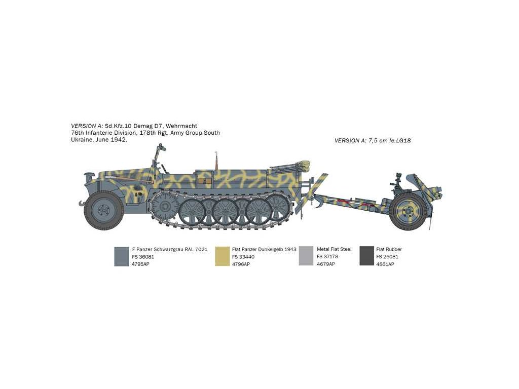 Polopásový tahač Sd.Kfz 10 Demag D7 používala německá vojska během druhé světové války ve velkém počtu na všech hlavních frontách od invaze do Polska přes severní Afriku až po Rusko. Byl navržen a vyvinut jako účinný hlavní tahač pro malá vlečná děla, jako byly protiletadlové a protitankové kanóny. Demag D7 mohl kromě tažení děla nebo přívěsu přepravovat osm vojáků v plné polní. Šestiválcový motor Maybach o objemu 4,2 litru, umístěný v přední části vozidla, mu poskytoval výkon 99 koní. Díky tomu mohl tento „polopásák“ dosáhnout maximální rychlosti 65 km/h a disponoval dobrými jízdními vlastnostmi na silnici i v terénu. Vozidlo bylo spolehlivé a flexibilní a bylo vyrobeno v důležitém počtu kusů a v několika verzích. Lehká houfnice Le. IG 18 byla určena k poskytování dělostřelecké podpory pěším rotám. K jejímu transportu se používaly tahače DEMAG nebo Protze. Byla spolehlivá a přesná, během války však byla často nahrazována silnějšími a zároveň lehčími minomety.
