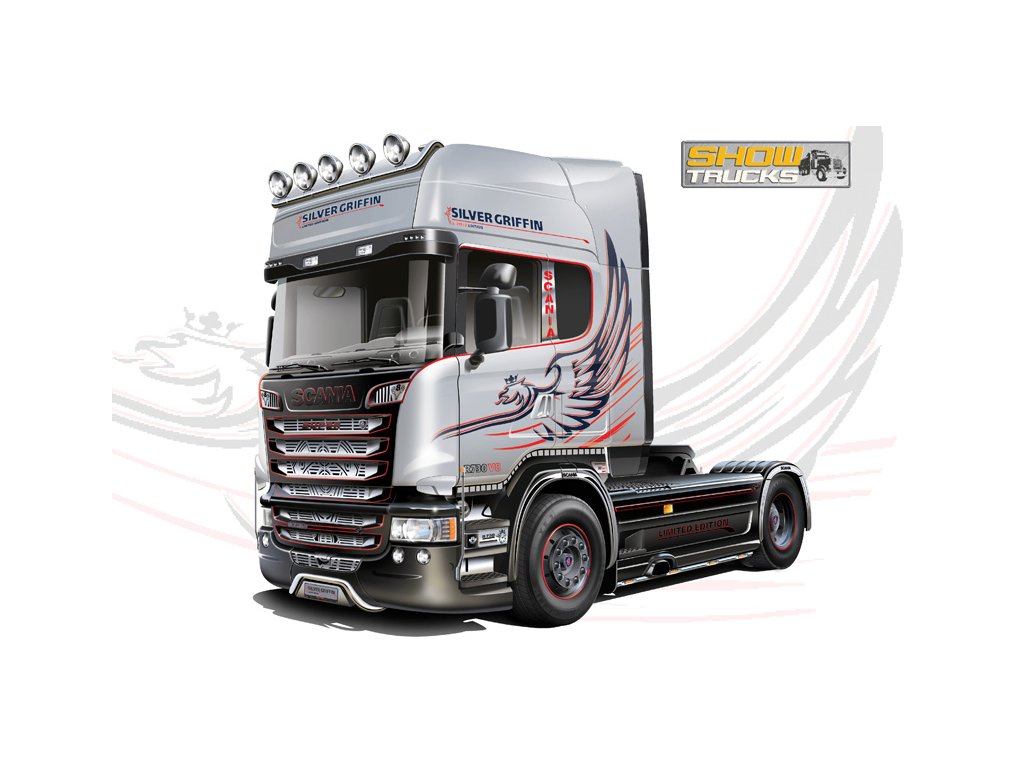 Těžké tahače Scania řady R jsou k dostání s motory V8 a byly vyvinuty na základě současných požadavků světového trhu. Tyto agregáty jsou postaveny tak, aby zvládly i ty nejtěžší úkoly, a obzvláště oceňována je jejich bytelnost, reaktivita a úspornost. Díky nim jsou vozy této řady připraveny splnit i ty nejnáročnější požadavky na spotřebu paliva a spolehlivost. Vzhled těchto strojů budí na silnici značně impozantní dojem a ne náhodou jsou považovány za jedničku na slavných akcích “SHOW TRUCKS”, na kterých se předvádějí vyšperkované tahače. Jejich výjimečná vizáž zároveň dobře ladí s exkluzivními novými interiéry, které posyktují řidiči opravdu vysokou úroveň pohodlí a zájemcům dávají na výběr z široké řady barev a materiálů. Kromě toho je navíc tento model dotažen k dokonalosti pomocí fantastických obtisků a „pokovených“ samolepek okamžitě připravených k použití. Balení dále obsahuje také nové plastové části imitující chrom, které modelu ještě přidávají na realistickém vzezření.