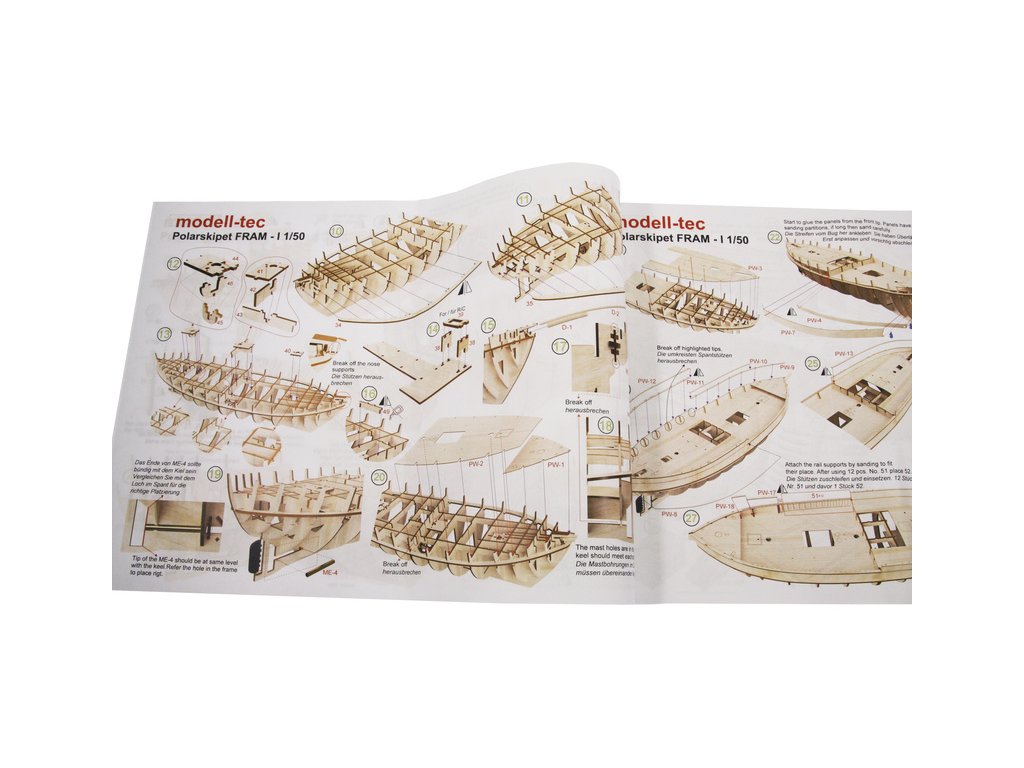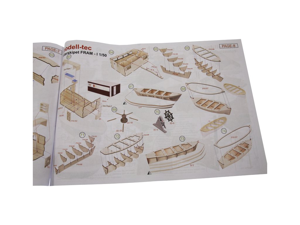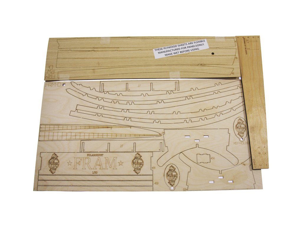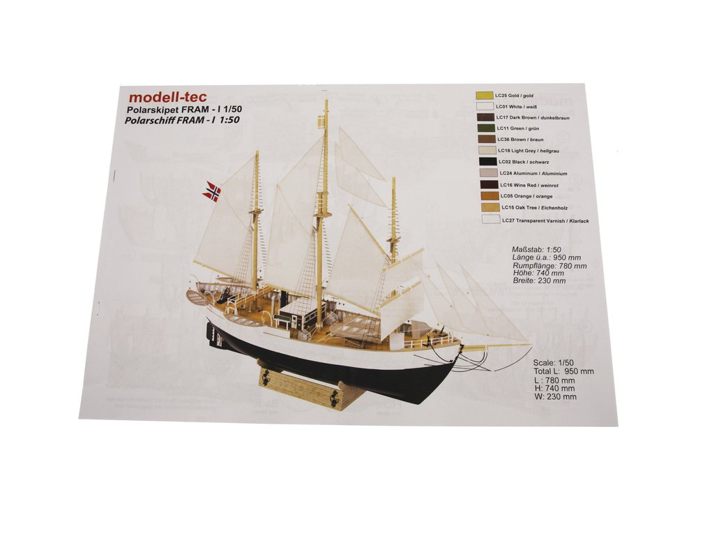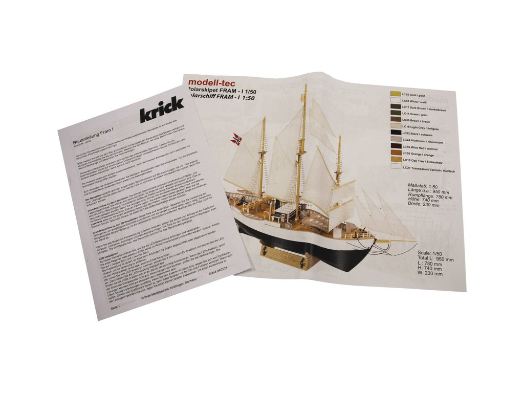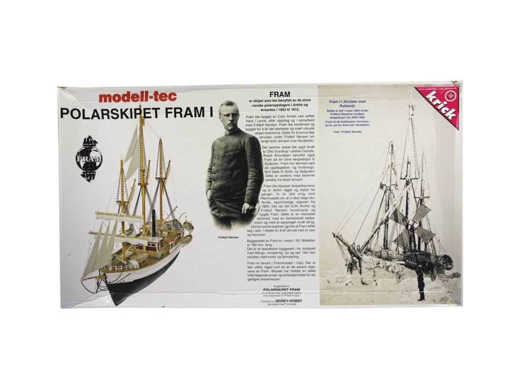 Stavebnice modelu polární lodi Fram I Polarschiff z roku 1893, v měřítku 1:50. Délka modelu lodi je 790mm, stavba převážně ze dřeva s drobnými doplňky, součástí je stavební plán. Loď, se kterou norští polárníci prozkoumávali Arktidu a Antarktidu v letech 1893 až 1912.