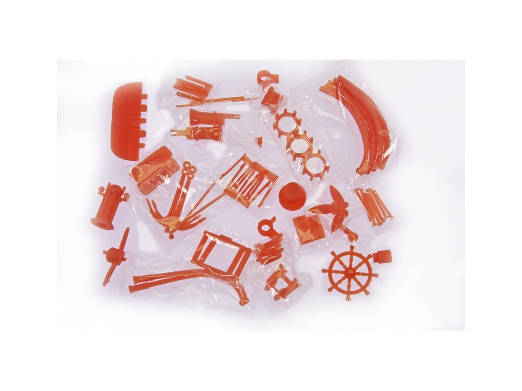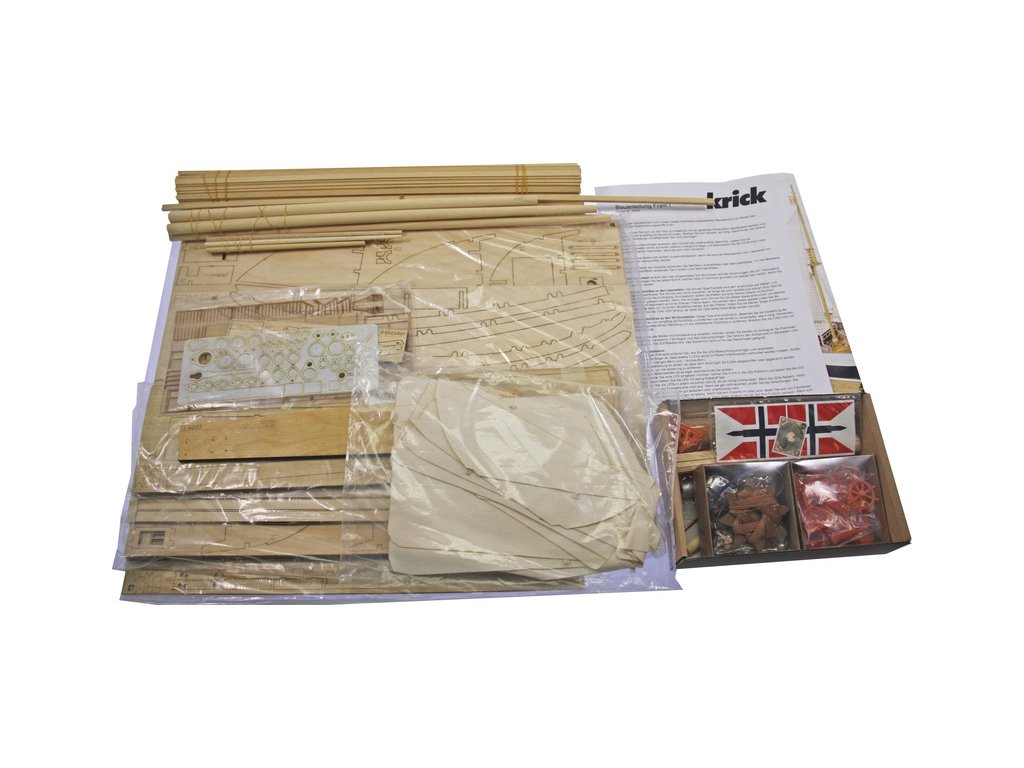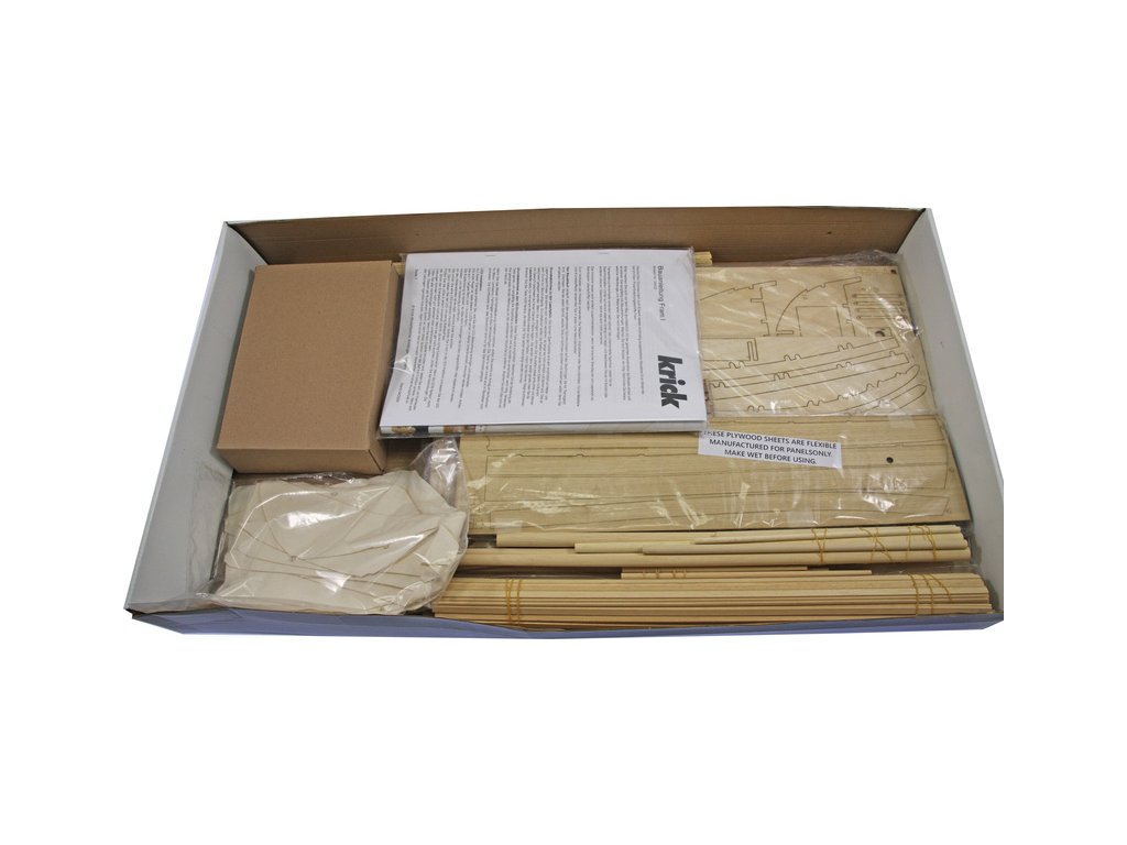 Balení obsahuje laserem řezané překližkové díly na několika deskách, maketové doplňky z kovu, dřeva a plastu, sadu plachet, sada příslušenství vyřezaná laserem v plastu, vlajka, motouz na lanoví, manuál psaný manuál obrazový EN.