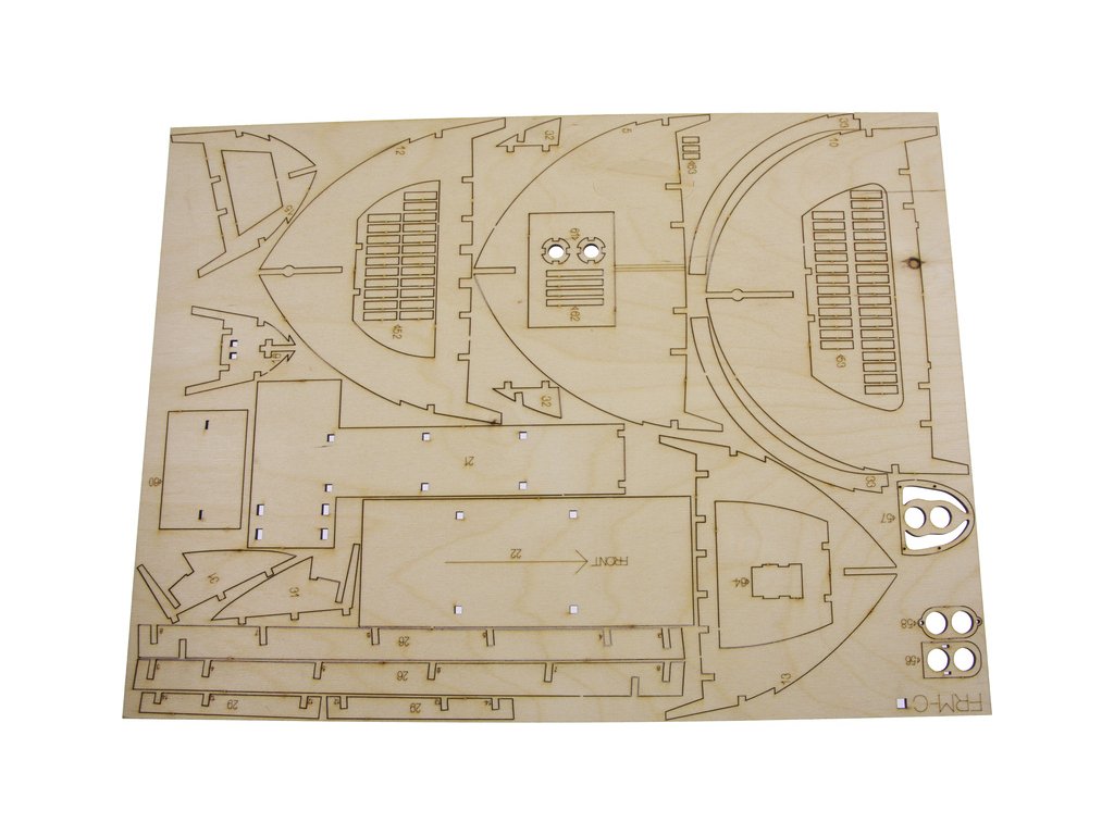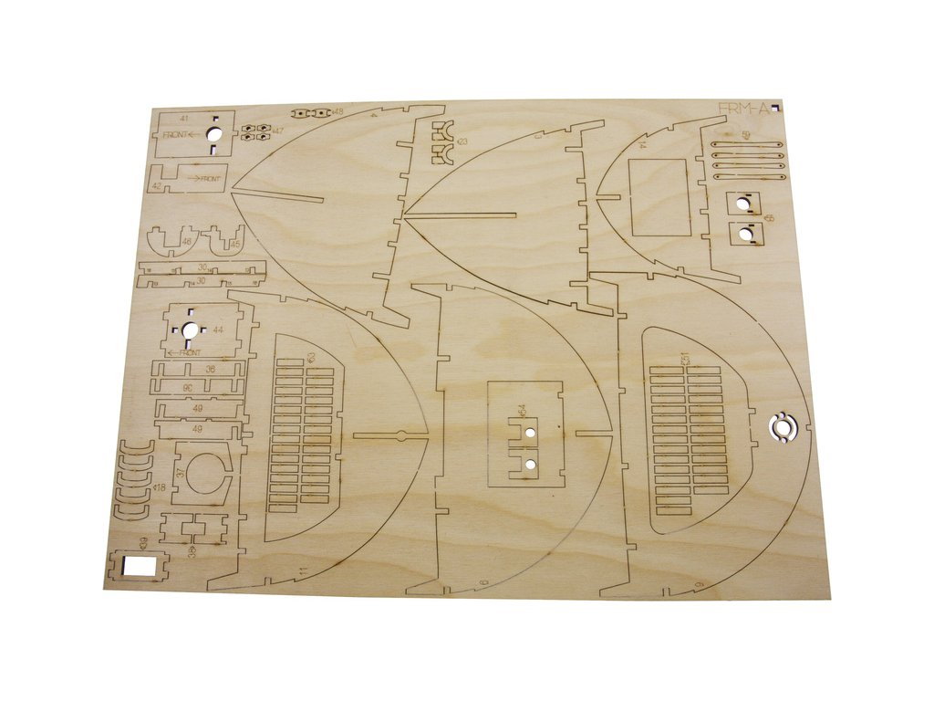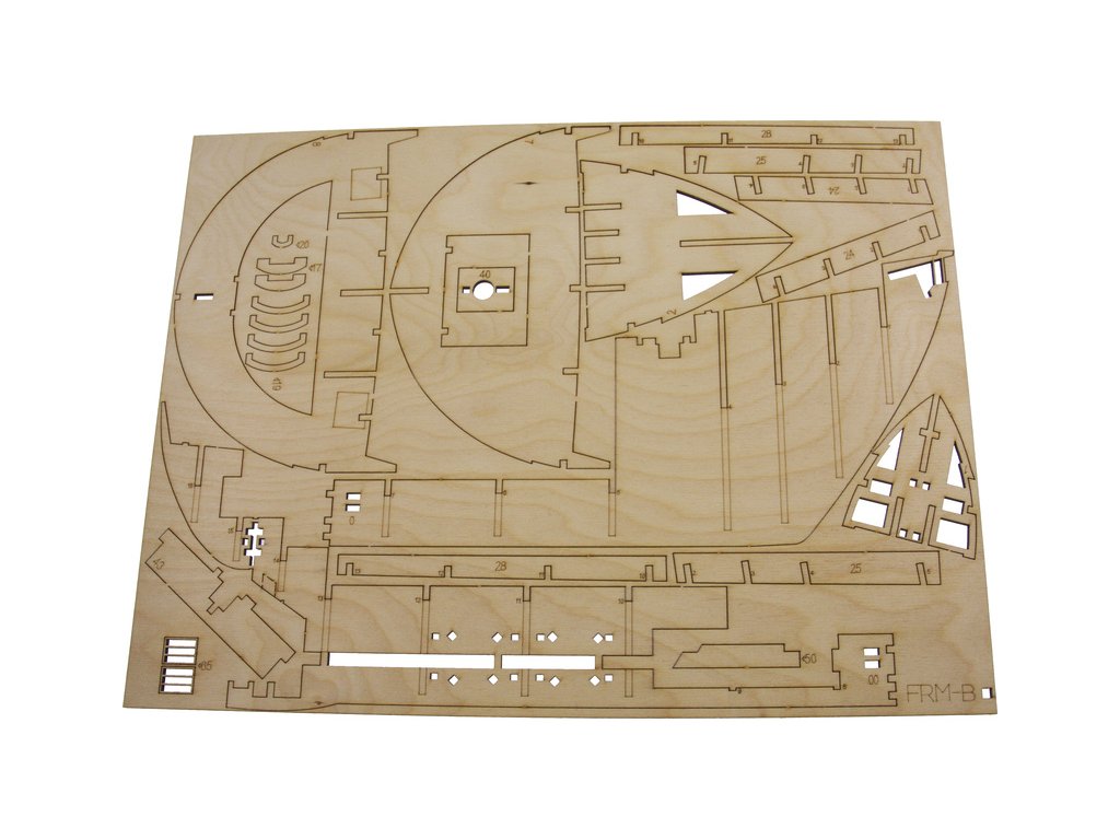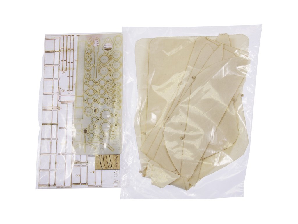 Po otevření víka krabice naleznete dřevěné díly modelu z překližky, drobné součásti uzavřené v sáčcích, sadu výkresů a manuál.