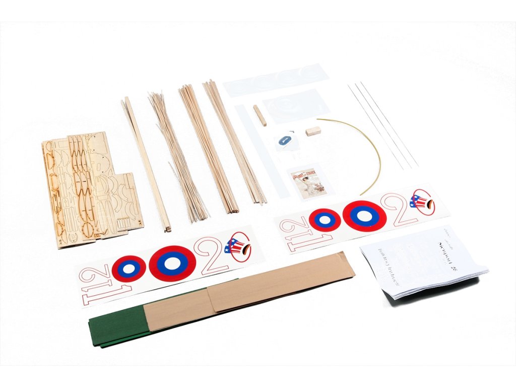 Stavebnice obsahuje: balsové laserem vyřezávané díly, balsové nosníky, vakuově lisované díly (kryt motoru, kola...), čirou plastovou fólii na větrný štítek, ocelovou strunu na podvozek a další drobné díly, barevný potahový papír, aršík samolepek, stavební plán.