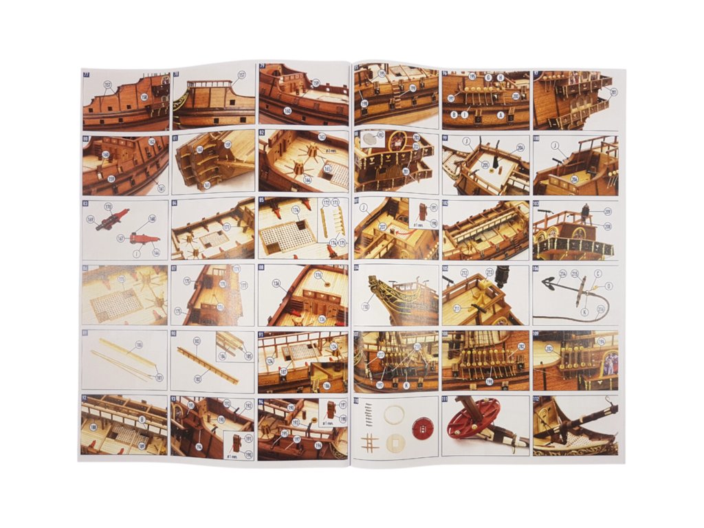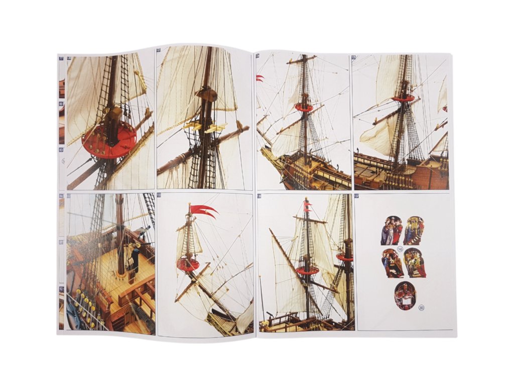 Balení obsahuje laserem řezané dřevěné díly, plaňky, palubu, stožáry, dřevěné díly, kovové odlitky, mosazné díly, lanoví, ušité plachty, vlajky. Návod a stavební výkresy.