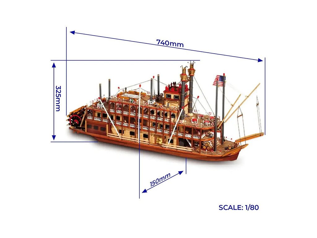 Stavebnice neplovoucího modelu lodi OCCRE Mississippi kolesový parník, v měřítku 1:80. V balení jsou díly pro stavbu - laserem řezané díly, lišty, mosazné fotolepy, lanoví a další. Stavební výkresy a návod.