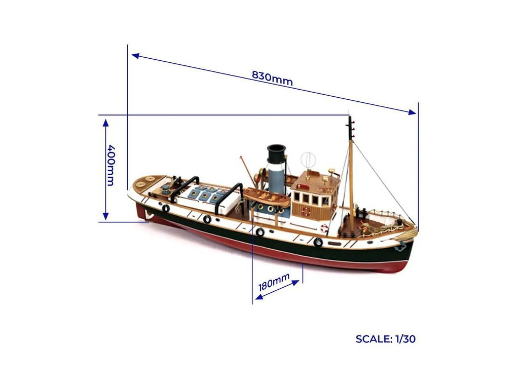 Stavebnice neplovoucího (možnost přestavby na RC) modelu lodi OCCRE Ulises remorkér, v měřítku 1:30. V balení jsou díly pro stavbu - laserem řezané díly, lišty, mosazné fotolepy, lanoví a další. Stavební výkresy a návod.