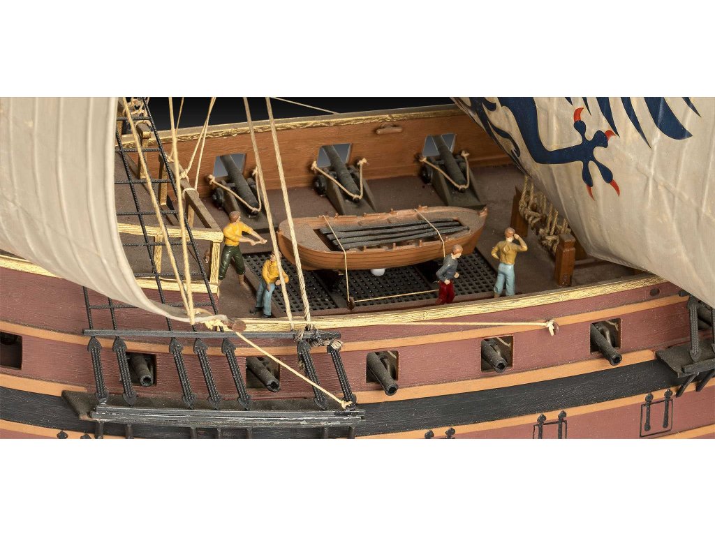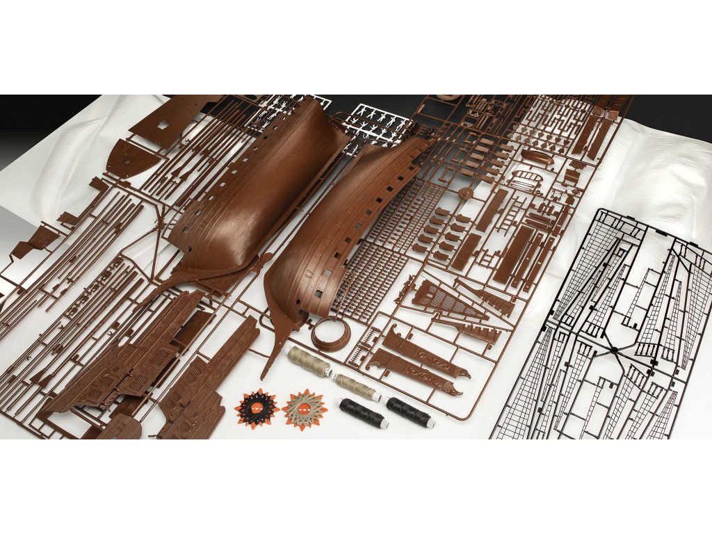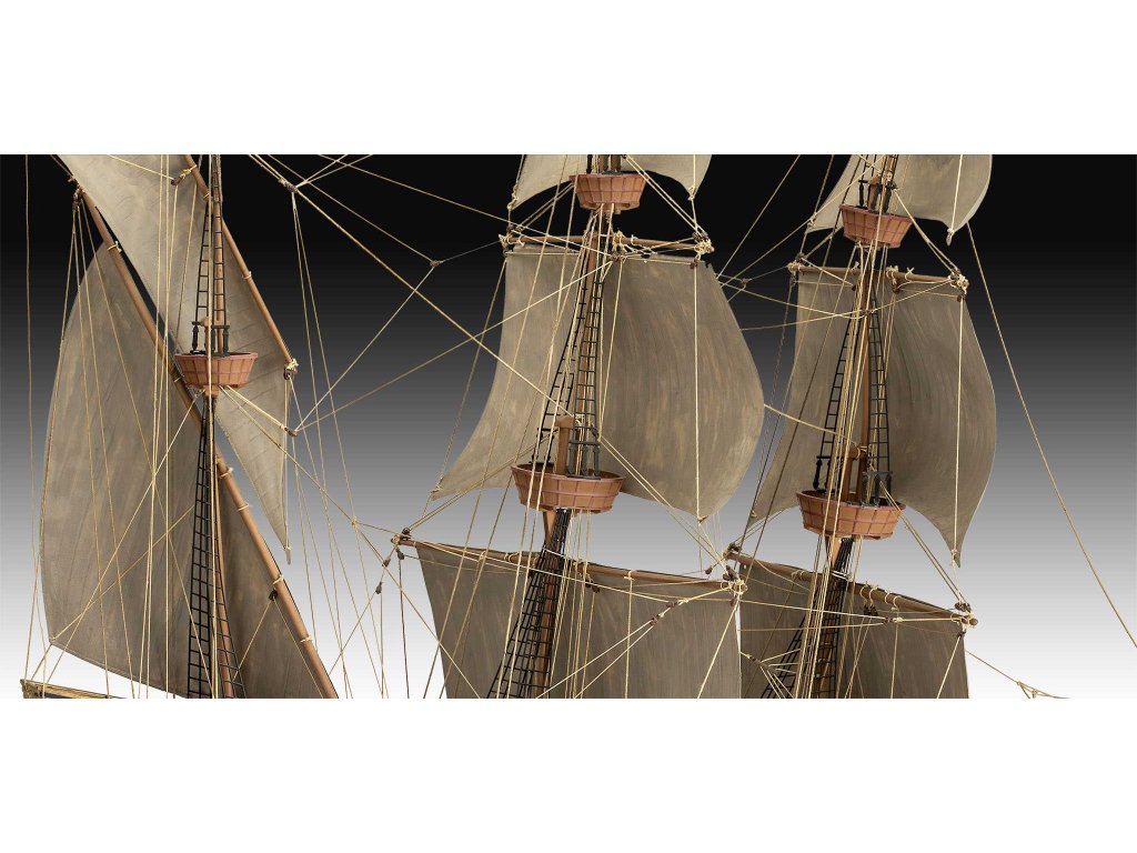 Model lodě ke slepení. Velikost: 1:96; 72,4 cm. Balení obsahuje: 306 dílků ke slepení.Z historické perspektivy byla ve zlatém věku plachetních lodí španělská galeona jednou z nejslavnějších lodí svého typu. První galeony se objevily v polovině šestnáctého století. Tyto populární plachetnice sloužily jako válečné i jako obchodní lodě po téměř sto let. Galeona je přímým následovníkem dřívějších galér poháněných vesly. Její trup byl užší než masivní a těžkopádné trupy takzvaných nao, i přesto ale její nákladní prostor uvezl obrovské množství zboží. Španělské galeony brázdily širá moře s náklady šperků, zlata, drahých látek a jiného cenného zboží. Aby se dokázaly ubránit proti útokům pirátů, byly vyzbrojeny těžkými mosaznými děly. Proslulé španělské loďstvo z roku 1588 disponovalo více než 70 takovými ozbrojenými galeonami. V jedné z nejslavnějších námořních bitev všech dob se mocná španělská flotila postavila o poznání menší námořní síle loďstva anglické královny Alžběty I. Španělský král Filip II. zamýšlel dopravit pomocí svého silného loďstva španělskou armádu přes Lamanšský průliv a dobýt britské ostrovy. Britové, kteří nedisponovali tak velkou flotilou, ale mezitím mobilizovali všechny své obranné síly. Jejich lodě pronásledovaly španělskou „Armadu“ déle než měsíc. Nakonec v červenci roku 1588 zakotvili Španělé v Gravelines. Tehdy osm hořících anglických lodí vplulo spolu s přílivem a nočním větrem přímo do středu španělské flotily. Protože se španělské lodě snažily co nejrychleji uniknout z dosahu planoucích lodí, odřízli Španělé ve spěchu kotevní lana a některé z korábů ihned ztroskotaly na útesech u pobřeží. Jindy disciplinovaná španělská formace se rozpadla a její rozptýlené pozůstatky odpluly směrem na sever kolem Skotska a Irska. Galeony měly značný vliv na práci loďařů po celém světě. Zcela očividná byla zejména jejich vylepšená ovladatelnost a jejich základní rysy tak brzy okopírovali téměř všichni stavitelé lodí v Evropě. Španělské galeony se také pyšnily pestrobarevnými nátěry a zdobnými štíty, které však byly nejen dekorativní, ale i doopravdy funkční.