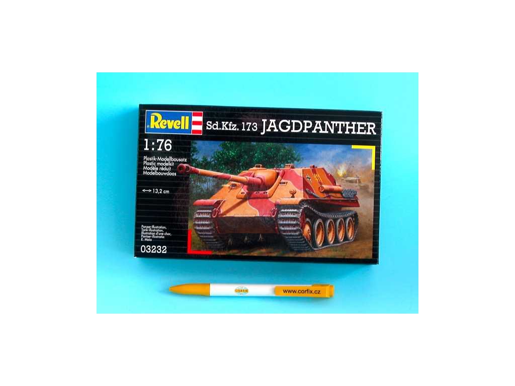Model tanku ke slepení. Velikost: 1:76; 13,2 cm. Balení obsahuje: 51 dílků ke slepení.Protitankové vozidlo Jagdpanther, odvozené od slavného tanku Panthera V, prokázal nadřazenost nad každým spojeneckým protivníkem, díky jeho úspěšné kombinaci mobility, obrněného kování a palebné síly. Jagdpanther, vybaven 88 mm Pak 43/3 L/71, byl uveden do provozu v lednu roku 1944. Pohonná jednotka: 600 hp V-12 Maybach benzínový motor; maximální rychlost: 55 km/h; posádka oh 5.