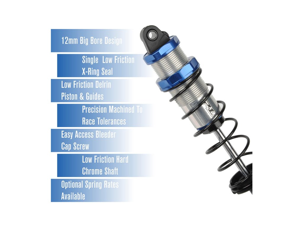 Nová generace tlumičů Pro-Line Pro-Spec Shocks! Nyní k dispozici sestavené, stačí naplnit silikonovým olejem dle vašeho výběru (není součástí balení). Tlumiče Pro-Spec mají průměr 12 mm a těsnící X-kroužky s nízkým třením. Pistnice o průměru 3.5 mm jsou tvrdě pochromované pro vysokou odolnost. Písty a vodící otvor pro pístnici je vyroben z hedvábně hladkého bílého Delrinu
